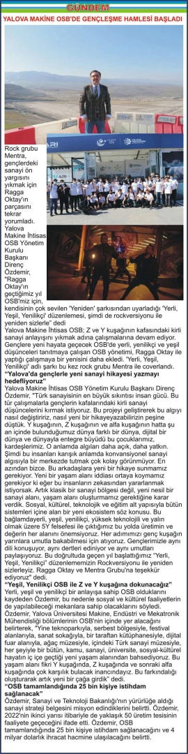 Rock grubu Mentra, gençlerdeki sanayi ön yargısını yıkmak için Ragga Oktay’ın parçasını tekrar yorumladı. Yalova Makine İhtisas OSB Yönetim Kurulu Başkanı Direnç Özdemir, "Ragga Oktay'ın geçtiğimiz yıl OSB'miz için, kendisinin çok sevilen 'Yeniden' şarkısından uyarladığı 'Yerli, Yeşil, Yenilikçi' düzenlemesi, şimdi de rockversiyonu ile yeniden sizlerle” dedi