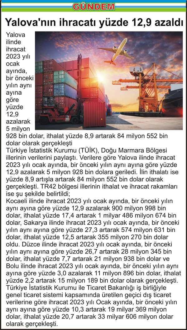 Yalova ilinde ihracat 2023 yılı ocak ayında, bir önceki yılın aynı ayına göre yüzde 12,9 azalarak 5 milyon 928 bin dolar, ithalat yüzde 8,9 artarak 84 milyon 552 bin dolar olarak gerçekleşti