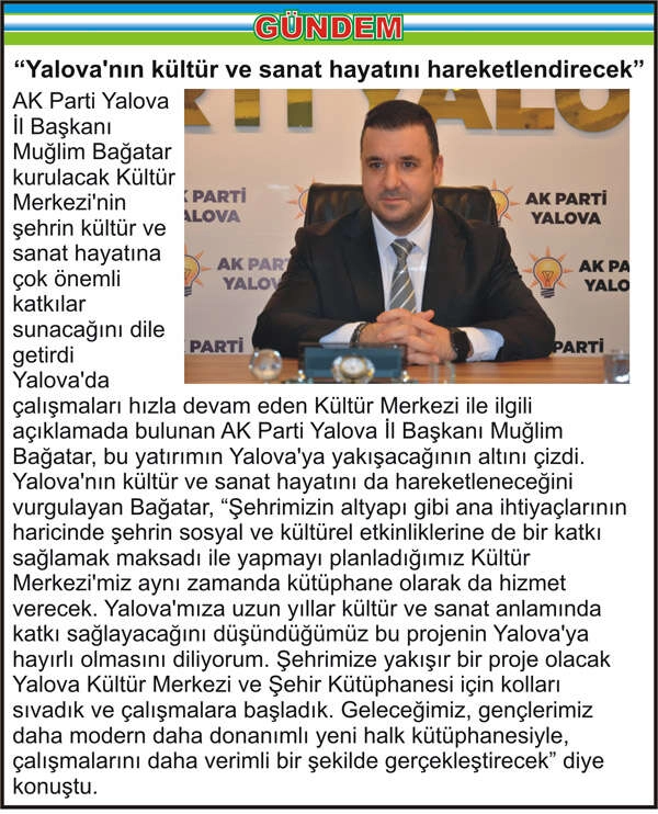 AK Parti Yalova İl Başkanı Muğlim Bağatar kurulacak Kültür Merkezi’nin şehrin kültür ve sanat hayatına çok önemli katkılar sunacağını dile getirdi Yalova’da çalışmaları hızla devam eden Kültür Merkezi ile ilgili açıklamada bulunan AK Parti Yalova İl Başkanı Muğlim Bağatar, bu yatırımın Yalova’ya yakışacağının altını çizdi. Yalova’nın kültür ve sanat hayatını da hareketleneceğini vurgulayan Bağatar, “Şehrimizin altyapı gibi ana ihtiyaçlarının haricinde şehrin sosyal ve kültürel etkinliklerine de bir katkı sağlamak maksadı ile yapmayı planladığımız Kültür Merkezi’miz aynı zamanda kütüphane olarak da hizmet verecek. Yalova’mıza uzun yıllar kültür ve sanat anlamında katkı sağlayacağını düşündüğümüz bu projenin Yalova’ya hayırlı olmasını diliyorum. Şehrimize yakışır bir proje olacak Yalova Kültür Merkezi ve Şehir Kütüphanesi için kolları sıvadık ve çalışmalara başladık. Geleceğimiz, gençlerimiz daha modern daha donanımlı yeni halk kütüphanesiyle, çalışmalarını daha verimli bir şekilde gerçekleştirecek” diye konuştu.