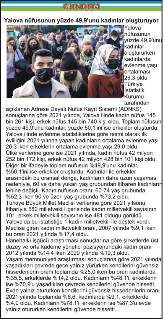 Yalova nüfusunun yüzde 49,9’unu kadınlar oluştururken kadınlarda evlenme yaşı ortalaması 26,3 oldu Türkiye İstatistik Kurumu tarafından açıklanan Adrese Dayalı Nüfus Kayıt Sistemi (ADNKS) sonuçlarına göre 2021 yılında, Yalova ilinde kadın nüfus 145 bin 261 kişi, erkek nüfus 145 bin 740 kişi oldu. Toplam nüfusun yüzde 49,9'unu kadınlar, yüzde 50,1'ini ise erkekler oluşturdu. Yalova ilinde evlenme istatistiklerine göre resmi olarak ilk evliliğini 2021 yılında yapan kadınların ortalama evlenme yaşı 26,3 iken erkeklerin ortalama evlenme yaşı 29,0 oldu. Ülke verilerine göre ise 2021 yılında, kadın nüfus 42 milyon 252 bin 172 kişi, erkek nüfus 42 milyon 428 bin 101 kişi oldu. Diğer bir ifadeyle toplam nüfusun %49,9'unu kadınlar, %50,1'ini ise erkekler oluşturdu. Kadınlar ile erkekler arasındaki bu oransal denge, kadınların daha uzun yaşaması nedeniyle, 60 ve daha yukarı yaş grubundan itibaren kadınların lehine değişti. Kadın nüfusun oranı, 60-74 yaş grubunda %52,3 iken 90 ve üzeri yaş grubunda %73,2 oldu. Türkiye Büyük Millet Meclisi verilerine göre 2021 yılsonu itibarıyla 582 milletvekili içerisinde kadın milletvekili sayısının 101, erkek milletvekili sayısının ise 481 olduğu görüldü. Yalova’da bu istatistiğe 1 kadın milletvekili ile destek verdi. Meclise giren kadın milletvekili oranı, 2007 yılında %9,1 iken bu oran 2021 yılında %17,4 oldu. Hanehalkı işgücü araştırması sonuçlarına göre şirketlerde üst düzey ve orta kademe yönetici pozisyonundaki kadın oranı 2012 yılında %14,4 iken 2020 yılında %19,3 oldu. Yaşam memnuniyeti araştırması sonuçlarına göre 2021 yılında yaşadıkları çevrede gece yalnız yürürken kendilerini güvensiz hissedenlerin oranı toplamda %25,0 iken bu oran kadınlarda %35,5, erkeklerde %14,2 oldu. Kadınların %48,1'i, erkeklerin ise %70,9'u yaşadıkları çevrede kendilerini güvende hissetti. Evde yalnız otururken kendilerini güvensiz hissedenlerin oranı 2021 yılında toplamda %6,6, kadınlarda %9,1, erkeklerde %4,0 oldu. Kadınların %78,1'i, erkeklerin ise %87,3'ü evde yalnız otururken kendilerini güvende hissetti.