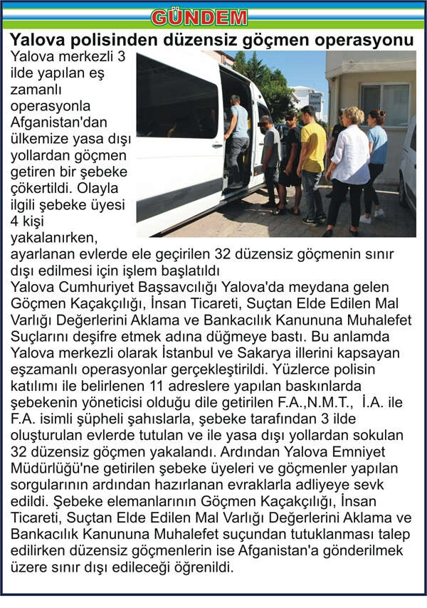 Yalova merkezli 3 ilde yapılan eş zamanlı operasyonla Afganistan’dan ülkemize yasa dışı yollardan göçmen getiren bir şebeke çökertildi. Olayla ilgili şebeke üyesi 4 kişi yakalanırken, ayarlanan evlerde ele geçirilen 32 düzensiz göçmenin sınır dışı edilmesi için işlem başlatıldı Yalova Cumhuriyet Başsavcılığı Yalova’da meydana gelen Göçmen Kaçakçılığı, İnsan Ticareti, Suçtan Elde Edilen Mal Varlığı Değerlerini Aklama ve Bankacılık Kanununa Muhalefet Suçlarını deşifre etmek adına düğmeye bastı. Bu anlamda Yalova merkezli olarak İstanbul ve Sakarya illerini kapsayan eşzamanlı operasyonlar gerçekleştirildi. Yüzlerce polisin katılımı ile belirlenen 11 adreslere yapılan baskınlarda şebekenin yöneticisi olduğu dile getirilen F.A.,N.M.T., İ.A. ile F.A. isimli şüpheli şahıslarla, şebeke tarafından 3 ilde oluşturulan evlerde tutulan ve ile yasa dışı yollardan sokulan 32 düzensiz göçmen yakalandı. Ardından Yalova Emniyet Müdürlüğü’ne getirilen şebeke üyeleri ve göçmenler yapılan sorgularının ardından hazırlanan evraklarla adliyeye sevk edildi. Şebeke elemanlarının Göçmen Kaçakçılığı, İnsan Ticareti, Suçtan Elde Edilen Mal Varlığı Değerlerini Aklama ve Bankacılık Kanununa Muhalefet suçundan tutuklanması talep edilirken düzensiz göçmenlerin ise Afganistan’a gönderilmek üzere sınır dışı edileceği öğrenildi.