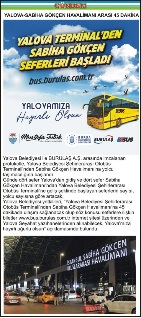 YALOVA-SABİHA GÖKÇEN HAVALİMANI ARASI 45 DAKİKA
