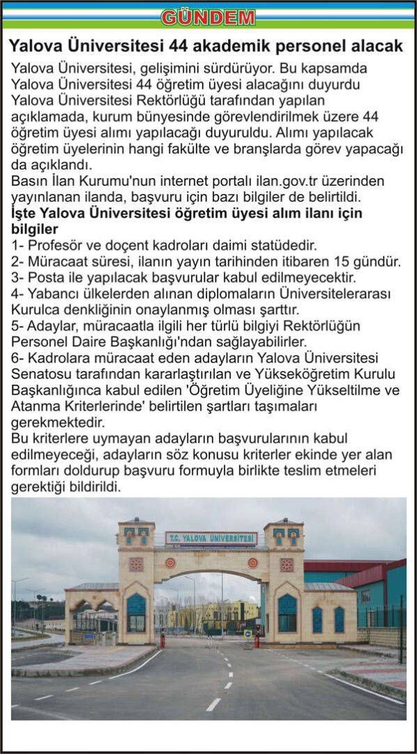 Yalova Üniversitesi, gelişimini sürdürüyor. Bu kapsamda Yalova Üniversitesi 44 öğretim üyesi alacağını duyurdu Yalova Üniversitesi Rektörlüğü tarafından yapılan açıklamada, kurum bünyesinde görevlendirilmek üzere 44 öğretim üyesi alımı yapılacağı duyuruldu. Alımı yapılacak öğretim üyelerinin hangi fakülte ve branşlarda görev yapacağı da açıklandı. Basın İlan Kurumu’nun internet portalı ilan.gov.tr üzerinden yayınlanan ilanda, başvuru için bazı bilgiler de belirtildi. İşte Yalova Üniversitesi öğretim üyesi alım ilanı için bilgiler 1- Profesör ve doçent kadroları daimi statüdedir. 2- Müracaat süresi, ilanın yayın tarihinden itibaren 15 gündür. 3- Posta ile yapılacak başvurular kabul edilmeyecektir. 4- Yabancı ülkelerden alınan diplomaların Üniversitelerarası Kurulca denkliğinin onaylanmış olması şarttır. 5- Adaylar, müracaatla ilgili her türlü bilgiyi Rektörlüğün Personel Daire Başkanlığı'ndan sağlayabilirler. 6- Kadrolara müracaat eden adayların Yalova Üniversitesi Senatosu tarafından kararlaştırılan ve Yükseköğretim Kurulu Başkanlığınca kabul edilen ‘Öğretim Üyeliğine Yükseltilme ve Atanma Kriterlerinde’ belirtilen şartları taşımaları gerekmektedir. Bu kriterlere uymayan adayların başvurularının kabul edilmeyeceği, adayların söz konusu kriterler ekinde yer alan formları doldurup başvuru formuyla birlikte teslim etmeleri gerektiği bildirildi.