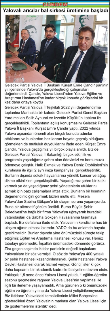 SAİM ÇOTUK Gelecek Partisi Yalova İl Başkanı Kürşat Emre Çandır partinin yıl içerisinde Yalova’da gerçekleştirdiği çalışmaları değerlendirdi. Çandır, Yalova Lisesi’nden Yalova Eğitim ve Araştırma Hastanesi’ne kadar birçok konuda görüşlerini bir kez daha ortaya koydu Gelecek Partisi Yalova İl Teşkilatı 2022 yılı değerlendirme toplantısı Marina’da bir kafede Gelecek Partisi Genel Başkan Yardımcıları Salih Aynural ve İzzettin Küçük’ün katılımı ile gerçekleştirildi. Toplantının açılış konuşmasını Gelecek Partisi Yalova İl Başkanı Kürşat Emre Çandır yaptı. 2022 yılında Yalova açısından önemli olan birçok konuda adımlar attıklarını ve bunlardan bazılarının hayata geçmiş olduğunu görmekten de mutluluk duyduklarını ifade eden Kürşat Emre Çandır, “Yalova geçtiğimiz yıl birçok olayla anıldı. Biz de Gelecek Partisi Yalova İl Bakanlığı birçok etkinlik ve programla yaşadığımız şehre olan ödevimizi ve borcumuzu ödemeye çalıştık. Halk Ekmek ve Yalova Deniz Otobüsleri’nin kurulması ile ilgili 2 ayrı imza kampanyası gerçekleştirdik. Bunların dışında sokak hayvanlarına yönelik konser ve ağaç dikme etkinlikleri gerçekleştirdik. Yaşadığımız şehre bir katkı vermek ya da yaşadığımız şehri yönetenlerin ufuklarını açmak için bazı çalışmalara imza attık. Bunların bir kısmının değerlendirildiğini görmek bizleri mutlu etti. Mesela Yalova’dan Sabiha Gökçen’e bir ulaşım sorunu yaşanıyordu. Buna bir alternatif çözüm üretildi. Bursa Büyük Şehir Belediyesi’ne bağlı bir firma Yalova’ya uğrayarak buradaki vatandaşları da Sabiha Gökçen Havaalanına taşımaya başladı. Biz defalarca ifade ettik. Yalova’nın kendisine has bir ulaşım ağının olması lazımdır. YADO da bu anlamda hayata geçirilmelidir. Bunlar dışında yine önümüzdeki süreçte takip ettiğimiz Eğitim ve Araştırma Hastanesi konusu var. Henüz tabelayı göremedik. İnşallah önümüzdeki dönemde görürüz. Zira geçen seçimde iktidar partisinin değerli başbakanı Yalovalılara bir söz vermişti. O söz de Yalova’ya 400 yataklı bir şehir hastanesi kazandırılmasıydı. Şehir hastanesi Yalova Devlet Hastanesi olarak hizmet veriyor. Gönül ister ki çok daha kapsamlı bir akademik kadro ile faaliyetine devam etsin. Yaklaşık 1,5 sene önce Yalova Lisesi yıkıldı. 1 eğitim-öğretim sezonu geçmesine rağmen Yalova Lisesi’nin yapılması ile ilgili bir ilerleme yaşayamadık. Ama görünen o ki önümüzdeki eğitim ve öğretim yılına da Yalova Lisesi yetiştirilemeyecek. Biz iktidarın Yalova’daki temsilcilerinin Millet Bahçesi’ne gösterdikleri özeni Yalova’nın markası olan Yalova Lisesi için de göstermelerini isterdik” dedi. konuştu.