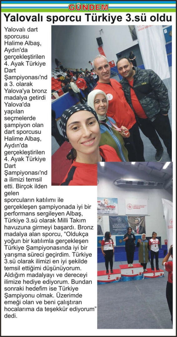 Yalovalı dart sporcusu Halime Albaş, Aydın’da gerçekleştirilen 4. Ayak Türkiye Dart Şampiyonası’nda 3. olarak Yalova’ya bronz madalya getirdi Yalova’da yapılan seçmelerde şampiyon olan dart sporcusu Halime Albaş, Aydın’da gerçekleştirilen 4. Ayak Türkiye Dart Şampiyonası’nda ilimizi temsil etti. Birçok ilden gelen sporcuların katılımı ile gerçekleşen şampiyonada iyi bir performans sergileyen Albaş, Türkiye 3.sü olarak Milli Takım havuzuna girmeyi başardı. Bronz madalya alan sporcu, “Oldukça yoğun bir katılımla gerçekleşen Türkiye Şampiyonasında iyi bir yarışma süreci geçirdim. Türkiye 3.sü olarak ilimizi en iyi şekilde temsil ettiğimi düşünüyorum. Aldığım madalyayı ve dereceyi ilimize hediye ediyorum. Bundan sonraki hedefim ise Türkiye Şampiyonu olmak. Üzerimde emeği olan ve beni çalıştıran hocalarıma da teşekkür ediyorum” dedi.