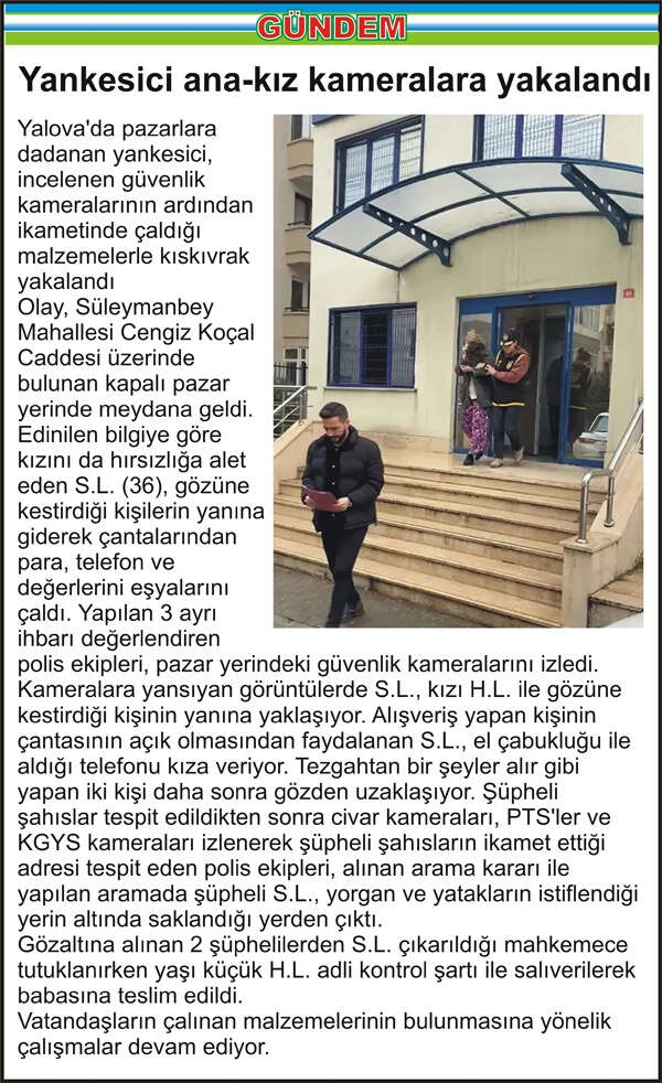 Yalova'da pazarlara dadanan yankesici, incelenen güvenlik kameralarının ardından ikametinde çaldığı malzemelerle kıskıvrak yakalandı Olay, Süleymanbey Mahallesi Cengiz Koçal Caddesi üzerinde bulunan kapalı pazar yerinde meydana geldi. Edinilen bilgiye göre kızını da hırsızlığa alet eden S.L. (36), gözüne kestirdiği kişilerin yanına giderek çantalarından para, telefon ve değerlerini eşyalarını çaldı. Yapılan 3 ayrı ihbarı değerlendiren polis ekipleri, pazar yerindeki güvenlik kameralarını izledi. Kameralara yansıyan görüntülerde S.L., kızı H.L. ile gözüne kestirdiği kişinin yanına yaklaşıyor. Alışveriş yapan kişinin çantasının açık olmasından faydalanan S.L., el çabukluğu ile aldığı telefonu kıza veriyor. Tezgahtan bir şeyler alır gibi yapan iki kişi daha sonra gözden uzaklaşıyor. Şüpheli şahıslar tespit edildikten sonra civar kameraları, PTS'ler ve KGYS kameraları izlenerek şüpheli şahısların ikamet ettiği adresi tespit eden polis ekipleri, alınan arama kararı ile yapılan aramada şüpheli S.L., yorgan ve yatakların istiflendiği yerin altında saklandığı yerden çıktı. Gözaltına alınan 2 şüphelilerden S.L. çıkarıldığı mahkemece tutuklanırken yaşı küçük H.L. adli kontrol şartı ile salıverilerek babasına teslim edildi. Vatandaşların çalınan malzemelerinin bulunmasına yönelik çalışmalar devam ediyor.
