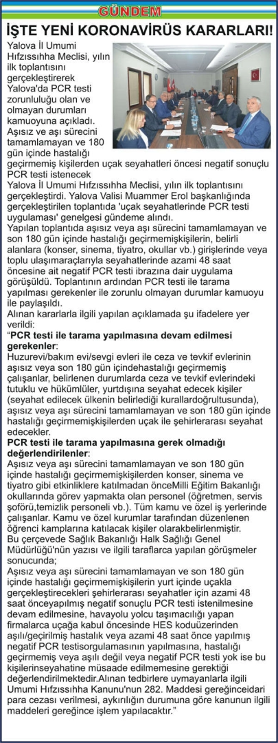Yalova İl Umumi Hıfzıssıhha Meclisi, yılın ilk toplantısını gerçekleştirerek Yalova’da PCR testi zorunluluğu olan ve olmayan durumları kamuoyuna açıkladı. Aşısız ve aşı sürecini tamamlamayan ve 180 gün içinde hastalığı geçirmemiş kişilerden uçak seyahatleri öncesi negatif sonuçlu PCR testi istenecek Yalova İl Umumi Hıfzıssıhha Meclisi, yılın ilk toplantısını gerçekleştirdi. Yalova Valisi Muammer Erol başkanlığında gerçekleştirilen toplantıda ‘uçak seyahatlerinde PCR testi uygulaması’ genelgesi gündeme alındı. Yapılan toplantıda aşısız veya aşı sürecini tamamlamayan ve son 180 gün içinde hastalığı geçirmemişkişilerin, belirli alanlara (konser, sinema, tiyatro, okullar vb.) girişlerinde veya toplu ulaşımaraçlarıyla seyahatlerinde azami 48 saat öncesine ait negatif PCR testi ibrazına dair uygulama görüşüldü. Toplantının ardından PCR testi ile tarama yapılması gerekenler ile zorunlu olmayan durumlar kamuoyu ile paylaşıldı. Alınan kararlarla ilgili yapılan açıklamada şu ifadelere yer verildi: “PCR testi ile tarama yapılmasına devam edilmesi gerekenler: Huzurevi/bakım evi/sevgi evleri ile ceza ve tevkif evlerinin aşısız veya son 180 gün içindehastalığı geçirmemiş çalışanlar, belirlenen durumlarda ceza ve tevkif evlerindeki tutuklu ve hükümlüler, yurtdışına seyahat edecek kişiler (seyahat edilecek ülkenin belirlediği kurallardoğrultusunda), aşısız veya aşı sürecini tamamlamayan ve son 180 gün içinde hastalığı geçirmemişkişilerden uçak ile şehirlerarası seyahat edecekler. PCR testi ile tarama yapılmasına gerek olmadığı değerlendirilenler: Aşısız veya aşı sürecini tamamlamayan ve son 180 gün içinde hastalığı geçirmemişkişilerden konser, sinema ve tiyatro gibi etkinliklere katılmadan önceMilli Eğitim Bakanlığı okullarında görev yapmakta olan personel (öğretmen, servis şoförü,temizlik personeli vb.). Tüm kamu ve özel iş yerlerinde çalışanlar. Kamu ve özel kurumlar tarafından düzenlenen öğrenci kamplarına katılacak kişiler olarakbelirlenmiştir. Bu çerçevede Sağlık Bakanlığı Halk Sağlığı Genel Müdürlüğü’nün yazısı ve ilgili taraflarca yapılan görüşmeler sonucunda; Aşısız veya aşı sürecini tamamlamayan ve son 180 gün içinde hastalığı geçirmemişkişilerin yurt içinde uçakla gerçekleştirecekleri şehirlerarası seyahatler için azami 48 saat önceyapılmış negatif sonuçlu PCR testi istenilmesine devam edilmesine, havayolu yolcu taşımacılığı yapan firmalarca uçağa kabul öncesinde HES koduüzerinden aşılı/geçirilmiş hastalık veya azami 48 saat önce yapılmış negatif PCR testisorgulamasının yapılmasına, hastalığı geçirmemiş veya aşılı değil veya negatif PCR testi yok ise bu kişilerinseyahatine müsaade edilmemesine gerektiği değerlendirilmektedir.Alınan tedbirlere uymayanlarla ilgili Umumi Hıfzıssıhha Kanunu’nun 282. Maddesi gereğinceidari para cezası verilmesi, aykırılığın durumuna göre kanunun ilgili maddeleri gereğince işlem yapılacaktır.”