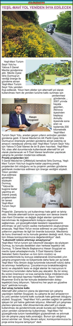 YEŞİL-MAVİ YOL YENİDEN İHYA EDİLECEK Yeşil-Mavi Turizm Seyir Yolu’nu Yalova İl Genel Meclisi gündemine aldı. Meclis Üyesi İdris Durmuş’un verdiği önerge ile gündeme alınan Yeşil-Mavi Turizm Seyir Yolu yeniden ihya edilecek. Yolun hem afetler için alternatif yol olarak kullanılması hem de yeniden turizme katkı sunması için yenilenmesi gündemde… 2007 yılında hayata geçirilen, Altınova ilçesinden başlayıp Armutlu ilçesinde sona eren ve toplamda 200 kilometrelik Yeşil-Mavi Turizm Seyir Yolu, aradan geçen yılların ardından yeniden gündeme geldi. İl Genel Meclisi’nin AK Partili Üyesi İdris Durmuş’un önerisiyle yeniden gündeme alınan eskimiş ve amacını neredeyse yitirmiş olan Yeşil-Mavi Turizm Seyir Yolu için Yalova İl Özel İdaresi de bir B planı hazırladı. Yeşil-Mavi Yol, olası afet durumlarında kullanılacak alternatif bir yol olarak planlanacak ve İl Özel İdaresi tarafından yapılacak çalışma ile yeniden modernize edilecek. Prestij projelerden biri İl Genel Meclisi’nin Çiftlikköylü temsilcisi İdris Durmuş, Yeşil-Mavi Turizm Yolu’nun bugüne kadar yapılmış prestij projelerden biri olduğunu ve bu projenin yeniden gündeme getirilerek modernize edilmesi için önerge verdiğini söyledi. Yolun yeniden ihya edilmesi gerektiğini söyleyen Durmuş, “Yalova’da bugüne kadar yapılmış en önemli prestij projelerinden bir tanesi Yeşil-Mavi Turizm Seyir Yolu Projesi’dir. Zamanla bu yol kullanılmaz hale geldi ve tahrip oldu. İlimizde alternatif turizm açısından son derece önemli olan Kent Ormanları ve değişik doğal alanları içerisinde barındırması ile doğaseverlerin kolayca ulaşımının sağlanması, yol güzergâhındaki tesislerin kapasitesinin artırılması ve yeni turizm cazibe merkezlerinin oluşturulması amacıyla, Yeşil Mavi Yol’un revize edilmesi ve yeni bağlantı yollarının yapılması ile ilgili bir öneride bulunduk. Meclisimiz de bunu önemsedi ve bu konuda gereken desteği verdi. Konu, tüm ihtisas komisyonlarımızca değerlendiriliyor” dedi. “Lokomotif rolünü artırmayı amaçlıyoruz” Yeşil-Mavi Yol’un turizm için lokomotif olacağını da söyleyen Durmuş, bu konuda destekleri olan herkese teşekkür etti. Durmuş, “İl Genel Meclis Başkanımız Hasan Soygüzel ve meclis üyesi arkadaşlarımızla, İl Özel İdaremiz Genel Sekreteri Selim Karahan ve tüm birim müdürü ve personellerimizle bu konuya odaklanarak önümüzdeki yılın çalışma programında ve bütçemizde daha fazla yer ayırarak Yeşil Mavi Yolu ilimizin doğa turizminde lokomotif rolünü daha da artırmayı hedefliyoruz. Çocuklarımıza bırakabileceğimiz temiz ve ulaşılabilir tesis ve doğal alanlar ile inanıyorum ki Yalova’mız turizmden daha fazla pay alacaktır. Bu bir süreç. Bu süreci önemsiyor ve kısa zamanda bütçe imkânlarımızla daha ileri seviyeye taşımayı hedefliyoruz. Sayın Valimiz Muammer Erol’a da her konuda desteklerinden dolayı teşekkürü borç biliyorum. Yalova’mız her şeyin en güzeline layık” şeklinde konuştu. Asıl amaç turizme katkı Alternatif afet yollarının plana da işlenmesi için çalışma yapıldığını belirten Soygüzel, bu çalışma ile asıl amaçlarının bu yolu yeniden turizme katkı sunacak hale getirmek olduğunu söyledi. Soygüzel, “Yeşil-Mavi Yol’u yeniden sağlıklı bir şekilde işleyen bir yol haline getirmek istiyoruz. Alternatif yol çalışması planlara işlenecek. Afet dönemlerinde alternatif yol olarak kullanılması da gündemimizde ancak burada asıl hedefimiz bu yolun yeniden canlandırılıp kullanılması. Yeşil-Mavi Yol güzergâhında turizm hareketliliğini güçlendirmek ve artırmak için de çalışma yapıp kafa yoracağız. Bunun için attığımız somut adımlar var. Süreç devam ediyor, komisyonlarımızca bu proje enine boyuna tartışılıyor” dedi.