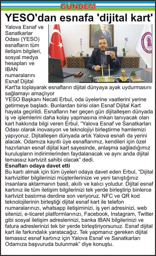 Yalova Esnaf ve Sanatkarlar Odası (YESO) esnafların tüm iletişim bilgileri, sosyal medya hesapları ve IBAN numaralarını Esnaf Dijital Kart’ta toplayarak esnafların dijital dünyaya ayak uydurmasını sağlamayı amaçlıyor YESO Başkanı Necati Erbul, oda üyelerine vaatlerini yerine getirmeye başladı. Bunlardan birisi olan Esnaf Dijital Kart hayata geçirildi. Esnafların her geçen gün dijitalleşen dünyada iş ve işlemlerini daha kolay yapmasına imkan tanıyacak olan kart hakkında bilgi veren Erbul, “Yalova Esnaf ve Sanatkarları Odası olarak inovasyon ve teknolojiyi birleştirme hamlemizi yapıyoruz. Dijitalleşen dünyada artık Yalova esnafı da yerini alacak. Odamıza kayıtlı üye esnaflarımız, kendileri için özel hazırlanan esnaf dijital kart sayesinde, anlaşma sağladığımız kuruluşların indirimlerinden faydalanacak ve aynı anda dijital temassız kartvizit sahibi olacak” dedi. Esnafları odaya davet etti Bu kartı almak için tüm üyeleri odaya davet eden Erbul, “Dijital kartvizitler bilgilerinizi müşterilerinize ve yeni tanıştığınız insanlara aktarmanın basit, akıllı ve kalıcı yoludur. Dijital esnaf kartınız ile tüm iletişim bilgilerinizi tek yerde birleştirip binlerce kartvizit bastırma derdine son veriyoruz. NFC ve QR kod teknolojilerinin birleştiği dijital esnaf kart ile telefon numaralarınızı, whatsapp iletişiminizi, iş yeri adresinizi, web sitenizi, e-ticaret platformlarınızı, Facebook, Instagram, Twitter gibi sosyal iletişim adreslerinizi, banka IBAN bilgilerinizi ve fatura adreslerinizi tek bir yerde birleştiriyorsunuz. Esnaf dijital kart ile farkındalık yaratacağız. Tek yapmanız gereken dijital temassız esnaf kartınız için Yalova Esnaf ve Sanatkarları Odamıza başvuruda bulunmak” diye konuştu.