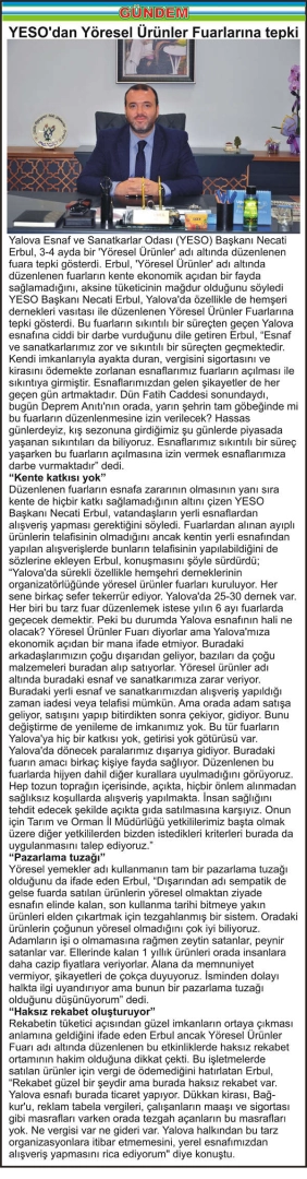 Yalova Esnaf ve Sanatkarlar Odası (YESO) Başkanı Necati Erbul, 3-4 ayda bir ’Yöresel Ürünler’ adı altında düzenlenen fuara tepki gösterdi. Erbul, ‘Yöresel Ürünler’ adı altında düzenlenen fuarların kente ekonomik açıdan bir fayda sağlamadığını, aksine tüketicinin mağdur olduğunu söyledi