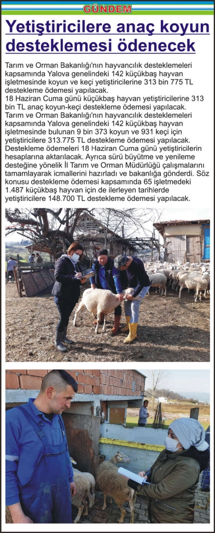 Yetiştiricilere anaç koyun desteklemesi ödenecek Tarım ve Orman Bakanlığı’nın hayvancılık desteklemeleri kapsamında Yalova genelindeki 142 küçükbaş hayvan işletmesinde koyun ve keçi yetiştiricilerine 313 bin 775 TL destekleme ödemesi yapılacak. 18 Haziran Cuma günü küçükbaş hayvan yetiştiricilerine 313 bin TL anaç koyun-keçi destekleme ödemesi yapılacak. Tarım ve Orman Bakanlığı’nın hayvancılık desteklemeleri kapsamında Yalova genelindeki 142 küçükbaş hayvan işletmesinde bulunan 9 bin 373 koyun ve 931 keçi için yetiştiricilere 313.775 TL destekleme ödemesi yapılacak. Destekleme ödemeleri 18 Haziran Cuma günü yetiştiricilerin hesaplarına aktarılacak. Ayrıca sürü büyütme ve yenileme desteğine yönelik İl Tarım ve Orman Müdürlüğü çalışmalarını tamamlayarak icmallerini hazırladı ve bakanlığa gönderdi. Söz konusu destekleme ödemesi kapsamında 65 işletmedeki 1.487 küçükbaş hayvan için de ilerleyen tarihlerde yetiştiricilere 148.700 TL destekleme ödemesi yapılacak.