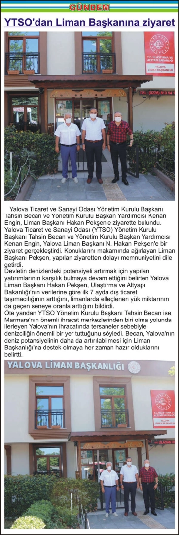 YTSO’dan Liman Başkanına ziyaret Yalova Ticaret ve Sanayi Odası Yönetim Kurulu Başkanı Tahsin Becan ve Yönetim Kurulu Başkan Yardımcısı Kenan Engin, Liman Başkanı Hakan Pekşen’e ziyarette bulundu. Yalova Ticaret ve Sanayi Odası (YTSO) Yönetim Kurulu Başkanı Tahsin Becan ve Yönetim Kurulu Başkan Yardımcısı Kenan Engin, Yalova Liman Başkanı N. Hakan Pekşen’e bir ziyaret gerçekleştirdi. Konuklarını makamında ağırlayan Liman Başkanı Pekşen, yapılan ziyaretten dolayı memnuniyetini dile getirdi. Devletin denizlerdeki potansiyeli artırmak için yapılan yatırımlarının karşılık bulmaya devam ettiğini belirten Yalova Liman Başkanı Hakan Pekşen, Ulaştırma ve Altyapı Bakanlığı’nın verilerine göre ilk 7 ayda dış ticaret taşımacılığının arttığını, limanlarda elleçlenen yük miktarının da geçen seneye oranla arttığını bildirdi. Öte yandan YTSO Yönetim Kurulu Başkanı Tahsin Becan ise Marmara’nın önemli ihracat merkezlerinden biri olma yolunda ilerleyen Yalova’nın ihracatında tersaneler sebebiyle denizciliğin önemli bir yer tuttuğunu söyledi. Becan, Yalova’nın deniz potansiyelinin daha da artırılabilmesi için Liman Başkanlığı’na destek olmaya her zaman hazır olduklarını belirtti.