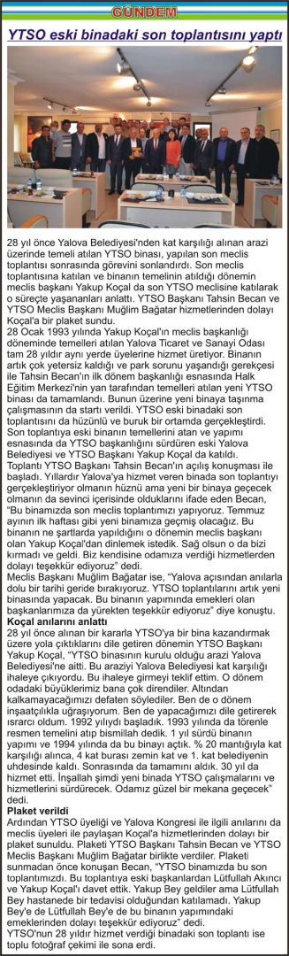 YTSO eski binadaki son toplantısını yaptı 28 yıl önce Yalova Belediyesi’nden kat karşılığı alınan arazi üzerinde temeli atılan YTSO binası, yapılan son meclis toplantısı sonrasında görevini sonlandırdı. Son meclis toplantısına katılan ve binanın temelinin atıldığı dönemin meclis başkanı Yakup Koçal da son YTSO meclisine katılarak o süreçte yaşananları anlattı. YTSO Başkanı Tahsin Becan ve YTSO Meclis Başkanı Muğlim Bağatar hizmetlerinden dolayı Koçal’a bir plaket sundu. 28 Ocak 1993 yılında Yakup Koçal’ın meclis başkanlığı döneminde temelleri atılan Yalova Ticaret ve Sanayi Odası tam 28 yıldır aynı yerde üyelerine hizmet üretiyor. Binanın artık çok yetersiz kaldığı ve park sorunu yaşandığı gerekçesi ile Tahsin Becan’ın ilk dönem başkanlığı esnasında Halk Eğitim Merkezi’nin yan tarafından temelleri atılan yeni YTSO binası da tamamlandı. Bunun üzerine yeni binaya taşınma çalışmasının da startı verildi. YTSO eski binadaki son toplantısını da hüzünlü ve buruk bir ortamda gerçekleştirdi. Son toplantıya eski binanın temellerini atan ve yapımı esnasında da YTSO başkanlığını sürdüren eski Yalova Belediyesi ve YTSO Başkanı Yakup Koçal da katıldı. Toplantı YTSO Başkanı Tahsin Becan’ın açılış konuşması ile başladı. Yıllardır Yalova’ya hizmet veren binada son toplantıyı gerçekleştiriyor olmanın hüznü ama yeni bir binaya geçecek olmanın da sevinci içerisinde olduklarını ifade eden Becan, “Bu binamızda son meclis toplantımızı yapıyoruz. Temmuz ayının ilk haftası gibi yeni binamıza geçmiş olacağız. Bu binanın ne şartlarda yapıldığını o dönemin meclis başkanı olan Yakup Koçal’dan dinlemek istedik. Sağ olsun o da bizi kırmadı ve geldi. Biz kendisine odamıza verdiği hizmetlerden dolayı teşekkür ediyoruz” dedi. Meclis Başkanı Muğlim Bağatar ise, “Yalova açısından anılarla dolu bir tarihi geride bırakıyoruz. YTSO toplantılarını artık yeni binasında yapacak. Bu binanın yapımında emekleri olan başkanlarımıza da yürekten teşekkür ediyoruz” diye konuştu. Koçal anılarını anlattı 28 yıl önce alınan bir kararla YTSO’ya bir bina kazandırmak üzere yola çıktıklarını dile getiren dönemin YTSO Başkanı Yakup Koçal, “YTSO binasının kurulu olduğu arazi Yalova Belediyesi’ne aitti. Bu araziyi Yalova Belediyesi kat karşılığı ihaleye çıkıyordu. Bu ihaleye girmeyi teklif ettim. O dönem odadaki büyüklerimiz bana çok direndiler. Altından kalkamayacağımızı defaten söylediler. Ben de o dönem inşaatçılıkla uğraşıyorum. Ben de yapacağımızı dile getirerek ısrarcı oldum. 1992 yılıydı başladık. 1993 yılında da törenle resmen temelini atıp bismillah dedik. 1 yıl sürdü binanın yapımı ve 1994 yılında da bu binayı açtık. % 20 mantığıyla kat karşılığı alınca, 4 kat burası zemin kat ve 1. kat belediyenin uhdesinde kaldı. Sonrasında da tamamını aldık. 30 yıl da hizmet etti. İnşallah şimdi yeni binada YTSO çalışmalarını ve hizmetlerini sürdürecek. Odamız güzel bir mekana geçecek” dedi. Plaket verildi Ardından YTSO üyeliği ve Yalova Kongresi ile ilgili anılarını da meclis üyeleri ile paylaşan Koçal’a hizmetlerinden dolayı bir plaket sunuldu. Plaketi YTSO Başkanı Tahsin Becan ve YTSO Meclis Başkanı Muğlim Bağatar birlikte verdiler. Plaketi sunmadan önce konuşan Becan, “YTSO binamızda bu son toplantımızdı. Bu toplantıya eski başkanlardan Lütfullah Akıncı ve Yakup Koçal’ı davet ettik. Yakup Bey geldiler ama Lütfullah Bey hastanede bir tedavisi olduğundan katılamadı. Yakup Bey’e de Lütfullah Bey’e de bu binanın yapımındaki emeklerinden dolayı teşekkür ediyoruz” dedi. YTSO’nun 28 yıldır hizmet verdiği binadaki son toplantı ise toplu fotoğraf çekimi ile sona erdi.