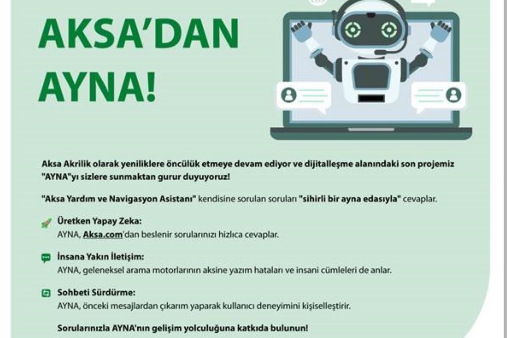Ayna’nın geleneksel arama motorlarının aksine yazım hatalarını ve insani cümleleri anlayarak doğru ve anlaşılır yanıtlar sunduğunu anlatan Aksa Akrilik Mali İşler Direktörü Erdinç Kazak “Ayna, aksa.com’dan beslenerek şirket performansı gibi konularda sorulara verdiği hızlı yanıtlarla yatırımcıların ihtiyaç duyduğu bilgilere anında ulaşmalarını sağlıyor. Ayrıca, önceki mesajları analiz ederek sohbeti sürdürebilir hale getiriyor ve kullanıcı deneyimini kişiselleştiriyor. Bu özellikle, bilgiye erişim sürecini daha verimli hale getiriyor ve müşterilerine özel çözümler sunuyor. Ayna sadece bir dijital asistan değil, aynı zamanda Aksa Akrilik’in iş dünyasındaki temsilcisi misyonuyla yatırımcılarla buluşuyor. Ayna ile Aksa'nın vizyonunu ve değerlerini yansıtarak, yatırımcılar ve diğer paydaşlarla daha güçlü ve etkili bir iletişim kurmak amaçlıyoruz” şeklinde bilgi verdi.
