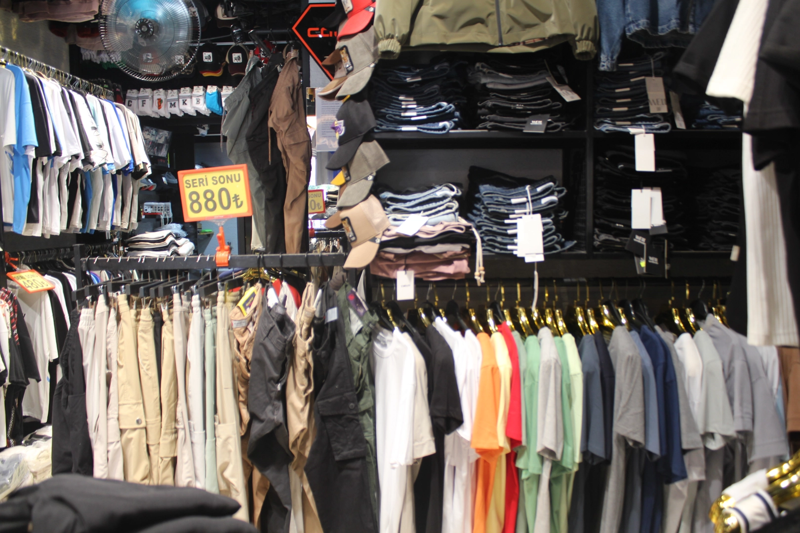 Gençlerde özellikle alamama durumu var. Mankenlere giydirdiğimiz teşhir ürünler var. Bunlar ister istemez deforme oluyor. Onları eskiden kimse almazdı ama şu an gençler onları alıyor. Çok şaşırıyorum. İkinci ürün etiketin yarısı kampanyam var mesela. Yalova’da pazar dahil bütün erkek giyim esnafını birleştirsinler hepsini karşıma koysunlar bu kaliteyi bu fiyata benden başka kimse satamaz. Benim ortağım yok, işçiliği kendim yapıyorum, maliyetleri düşündüğümden dolayı şu andaki kar marjım sirkülasyona dayalı. Eskiden ayda 30 bin TL kazanıyordum 300 bin TL sermaye ile kazanıyordum. Şimdi 1 milyon TL sermaye ile ayda 30 bin TL kazanmaya çalışıyorum. Sermaye gücümü artırıp aynı yaşam standardımı sürdürmeye çalışıyorum. Sürümden kazanmaya çalışıyorum. En azından ayakta kalmaya çalışıyorum. Benim şu an sattığım pantolonların piyasa fiyatları 900 ile 1000 TL arasında. Ben 800 TL’ye satıyorum ve ikinci ürünü yüzde 50 indirimli veriyorum. şu an pazarda bile 500 TL’ye kot pantolon yok. Müşterim bu kampanyamdan dolayı var. Kaliteyi düşürmeden sermaye gücünü artırıp sirkülasyon yöntemiyle yaşamaya çalışıyorum. Bu kadar dar alanda anca bu kadar yapabiliyoruz. Bu kadar çeşit için geniş bir alan lazım ama geniş alanların kirası 50 bin TL. Ben 30 bin TL kazanıyorum. Kirayı karşılamam mümkün değil. Şöyle bir durum da var, bir kesim fakirleşirken bir kesim zenginleşiyor. Arada artık uçurum var. O uçurumdan kaynaklı bir şekilde müşterimiz oluyor.” açıklamasında bulundu
