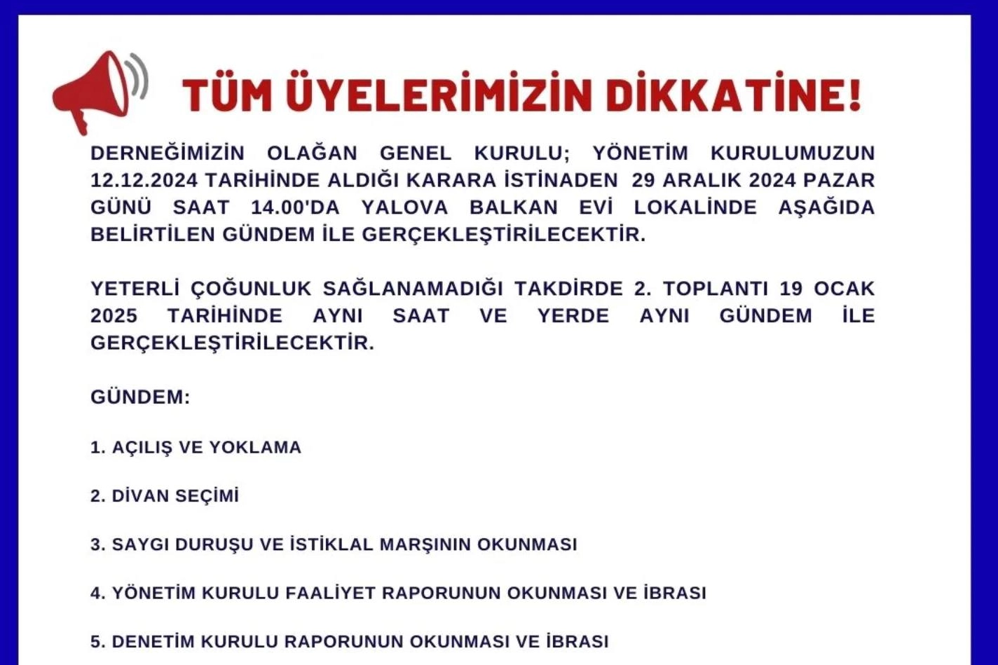 Yalova Balgöç resmi sosyal medya hesabından yapılan açıklamada, “Yalova Balkan Göçmenleri Eğitim Kültür ve Dayanışma Derneği Olağan Genel Kurulu; yönetim kurulumuzun 12. 12. 2024 tarihinde aldığı karara istinaden 29 Aralık 2024 Pazar günü saat 14.00'da Yalova Balkan Evi Lokalinde belirtilen gündem ile gerçekleştirilecektir. Yeterli çoğunluk sağlanamadığı takdirde 2. toplantı 19 Ocak 2025 tarihinde aynı saat ve yerde aynı gündem ile gerçekleştirilecektir” denildi.