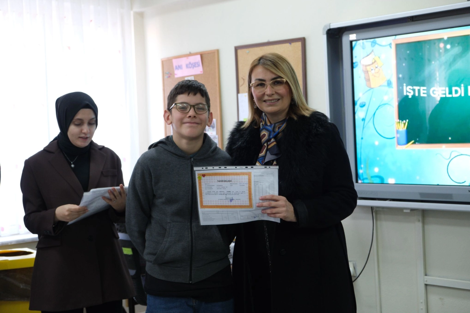 Öğrencilerle tek tek sohbet ederek karnelerini veren Başkan Fazlaca, öğretmen ve öğrencilere iyi tatiller diledi.