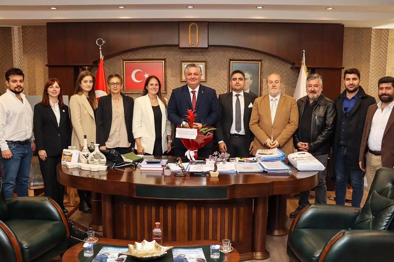 Yalova Barosu 16. Olağan Genel Kurulu’nda güven tazeleyerek yeniden başkan seçilen Avukat Elif Turnacı Çavuş ve yönetim kurulu üyeleri, Yalova Belediye Başkanı Mehmet Gürel’i makamında ziyaret etti. Ziyarette, Baro Başkanı Turnacı Çavuş, yeni yönetim kurulunun hedefleri ve projeleri hakkında bilgiler vererek, Yalova'da hukuk hizmetlerinin geliştirilmesi ve toplumda hukukun üstünlüğünün sağlanması konusundaki kararlılıklarını vurguladı ve yeni dönem çalışmaları hakkında bilgilendirmelerde bulundu. Başkan Gürel ise Yalova Barosu’nun şehirdeki önemli rolüne dikkat çekerek, Çavuş ve yönetimine yen dönem çalışmalarında başarılar diledi. Baro Başkanı Çavuş, misafirperverliği ve hoş sohbeti adına Başkan Gürel’e teşekkürlerini iletirken, Başkan Gürel’de nazik ziyaretleri adına Çavuş ve yönetimine teşekkür etti. Ziyaret, karşılıklı iyi dileklerin iletilmesiyle ve toplu hatıra fotoğrafı çekilmesi ile birlikte sona erdi.