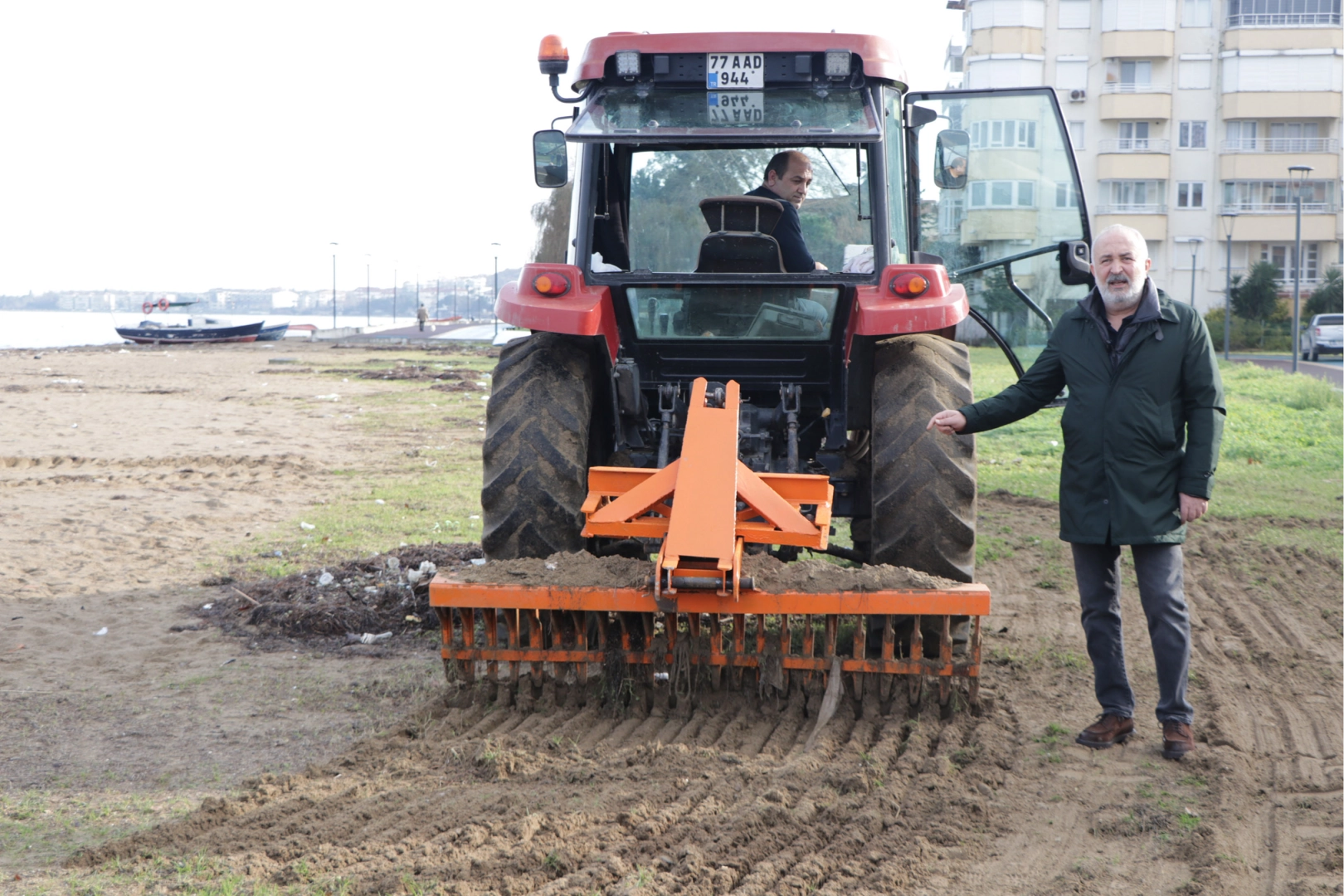 Tamamı hurda malzemelerden, Temizlik İşleri Müdürlüğü personelleri ve Fen İşleri Müdürlüğü kaynak ustalarının ortak çalışmasıyla belediyenin atölyelerinde geliştirilerek üretilen traktör arkası kumsal tırmığı, Çiftlikköy sahilinde özellikle olumsuz hava şartları ve fırtına sonrası meydana gelen kirlilik ve yosun birikintilerinin temizlenmesinde kullanılıyor.