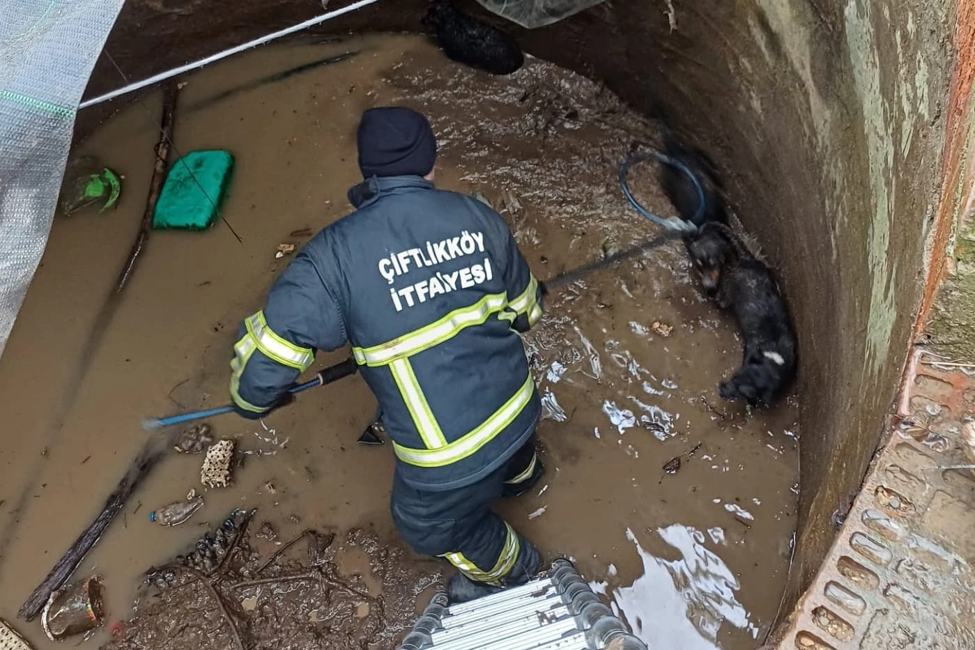 Edinilen bilgiye göre Çiftlikköy’de sahipsiz sokak köpeği içi su ve çamur dolu kuyuya düştü.