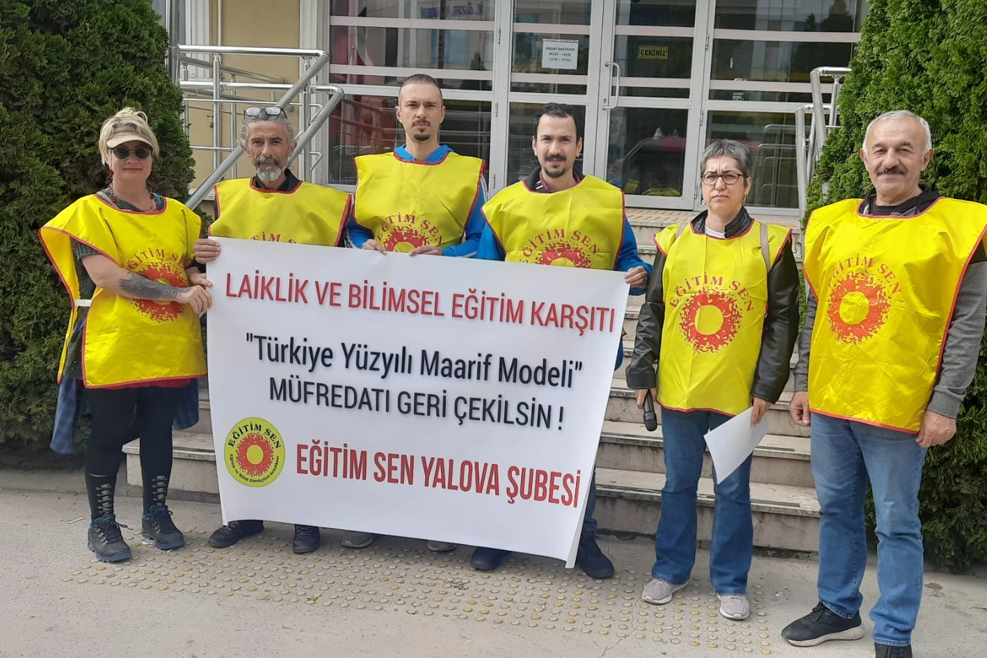 Yalova İl Milli Eğitim Müdürlüğü önünde yapılan basın açıklamasını Özlem Türk okudu. Müfredat değişikliklerinin okulöncesi, ilkokul, ortaokul ve lisede işlenecek derslerin içeriği ve bunlarla ilgili önemli ve tüm toplumu ilgilendiren düzenlemeler olduğunu belirten Türk, basın açıklamasında şu ifadelere yer verdi; “Normalde müfredat değişikliklerinin içeriğinin ne olacağı, nasıl bir değişiklik önerildiğinin bütün yönleriyle bilim insanları, eğitim bilimciler ve eğitim sendikalarının görüşleri alınarak, çeşitli yönleriyle tartışılarak belirlenmesi gerekir. Ancak MEB’in sürecin başından sonuna kadar yapmaya çalıştığı şey, ülkenin bugünü ve geleceğini yakından ilgilendiren böylesine önemli bir konuda ‘yangından mal kaçırır gibi’ hareket etmesi olmuştur. Eğitim sistemi açısından öğrencilere verilecek bilgiyi belirlemek ve seçmek, müfredat ve ders kitapları üzerinden öğrencilere aktarılması süreci başından sonuna siyasal bir nitelik taşımaktadır. Dolayısıyla bugün eğitim müfredatında yapılmak istenen değişiklikleri ve içeriği tartışılan ders kitaplarını iktidarın eğitimdeki siyasal-ideolojik hedeflerinden ayrı ya da bağımsız değerlendirmemiz mümkün değildir. Eğitim müfredatının çocukların, gençlerin, toplumun ve ülkenin gerçek ihtiyaçlarından çok, iktidarın siyasal-ideolojik çizgisine uygun hale getirilmesinin en somut yönü okullarda hangi bilgilerin, nasıl, hangi araçlar ve örnekler üzerinden verileceğidir. Mevcut iktidar çocuğa ya da bireye nasıl yaklaşıyor, nasıl bir insan modeli yetiştirmek istiyor, yetiştirdiği bireylerde hangi özellikler olmasını istiyorsa eğitim müfredatını da ona uygun şekilde hazırlamıştır. Müfredat değişikliklerinde laik ve bilimsel eğitim geri plana itilirken, bütün ders kitaplarında milli ve manevi değerlerin merkeze alındığı görülmektedir. Milli ve manevi değerler vurgusu yaratılan tüm eşitsizliklerin üzerini örtmek için kullanılmaktadır. MEB’in öncelikli hedefi eğitim müfredatı ve ders kitapları üzerinden iktidarın siyasal ideolojisinin açık ve gizli (örtük) olarak öğrencilere aktarılmasıdır. Müfredat taslağının başlığının ‘Türkiye Yüzyılı Maarif Modeli’ olarak belirlenmiş olması bu tespitimizi doğrulamaktadır. Ülkeyi ve gelecek nesilleri yakından ilgilendiren eğitim müfredatı gibi bir konuda, eğitim müfredatının siyasal ve ideolojik olarak iktidara yakın çevrelerin müdahalesiyle içerik olarak daha da geriye götürülmesi, bilime, laikliğe ve aydınlanma düşüncesine karşı adeta bayrak açılması söz konusudur. Ders kitaplarında yüzde 35 oranında ‘sadeleştirme’ yapıldığı iddiasıyla doğrudan bilim, tarih, felsefe ve sanat derslerinin hedef alındığı görülmektedir. Bazı derslerde ünite ve kazanım sayılarının azaltılarak ‘tek din, tek mezhep ve tek kimlik’ üzerinden ağırlıklı olarak hem dini, hem de milli ve manevi öğeler ve referanslarla donatılmış bir müfredat taslağı hazırlanmıştır. Müfredat taslağında Türkiye’de yaşayan farklı kimlikler, inançlar ve kültürler genellikle ya hiç görünmez kılınmış ya da karşı tarafta gösterilmiştir. Eğitim müfredatında 12 Eylül darbecilerinin izinden gidilerek Türk-İslam sentezinin benimsenmiş olması ve tek din, tek mezhep yaklaşımının daha da belirgin hale getirilmiş olması dikkat çekicidir. AK Parti iktidarında eğitimi hem içerik hem de biçimsel olarak dini kural ve referanslara göre biçimlendirme uygulamalarının nasıl hayata geçirildiği bilinmektedir. Geçtiğimiz yıllar içinde eğitim müfredatına yönelik bilim dışı müdahalelerin artmış, felsefe ve bilim ders saatlerinin azaltılmış, beden eğitimi, resim ve müzik ders saatlerinin azaltılarak yerine din dersleri getirilmiştir. Otizmli ve zihinsel engelli çocuklara yönelik zorunlu din dersi getirilmesi, okul öncesinde manevi değerler seminerleri verilmesi, yine okul öncesi, ilkokul ve ortaokul öğrencilerinin camilere götürülmesi, din eğitiminin fiilen okul öncesine ve kreşlere kadar indirilmesi gibi uygulamalar ilk akla gelen düzenlemelerdir. MEB’in ÇEDES ve benzeri projeler ve protokoller üzerinden eğitim sistemi içine faaliyet alanı açtığı Diyanet İşleri Başkanlığı’nın yanı sıra iktidarla ekonomik ve siyasal bağları olan dini vakıf ve cemaatler tarafından okullar, yurtlar, kurslar vb. üzerinden doğrudan iktidar desteği ile tıpkı bir örümcek ağı gibi bütün eğitim sistemini kuşatmış durumdadır. Yeni müfredat değişiklikleri okullar başta olmak üzere eğitim sisteminde yaşanan dinselleşme kuşatmasının en son ve en tehlikeli aşamasını oluşturmaktadır. MEB’in yeni müfredatı, düşünmeyen, sorgulamayan, eleştirmeyen, itiraz etmeyen nesiller yetiştirmek amacıyla hazırlanmıştır. Öğretim programlarında bilimsel eğitim ile ilgili olan pek çok nokta özenle sadeleştirme ya da ayıklamaya tabi tutulurken, tek adam rejiminin bütün hedeflerini açık ve gizli (örtük) amaç ve değerler üzerinden ders kitaplarına yerleştirerek kendilerince ‘dini’ ve ‘milli’ bir müfredat oluşturulmak istendiği anlaşılmaktadır.”
