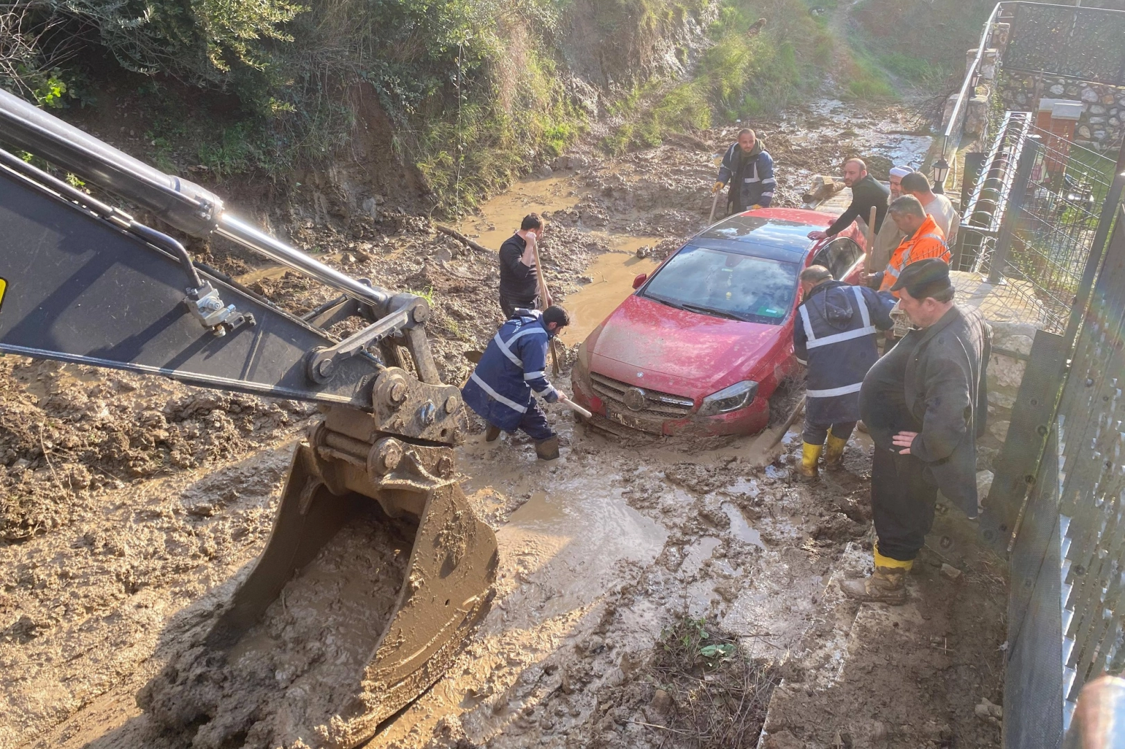 İhbar üzerine olay yerine gelen Esenköy Belediye ekipleri, iş makinelerinin yardımıyla çamura saplanan aracı mahsur kaldığı yerden kurtardı.