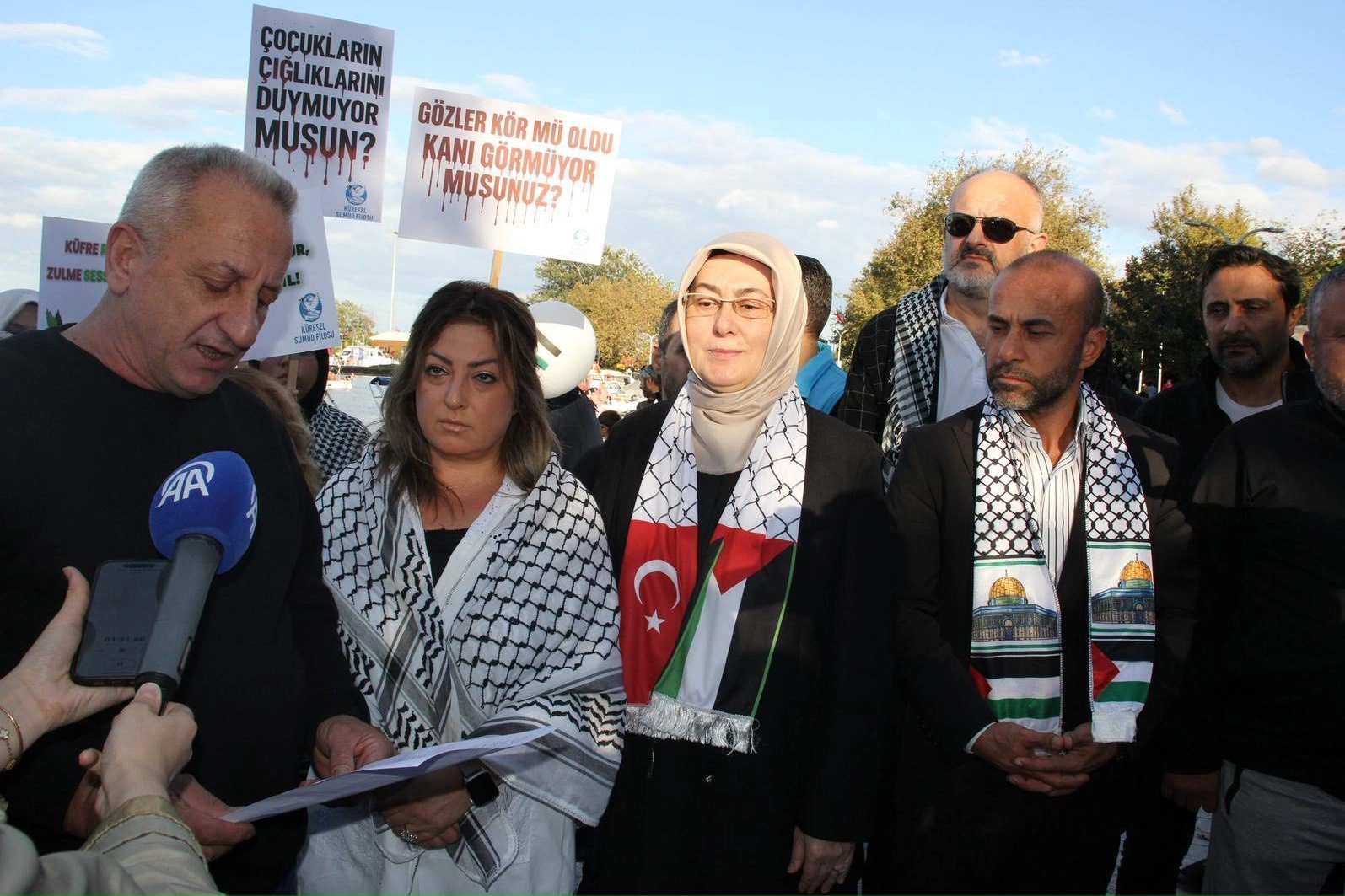 AK Parti Yalova Milletvekili Meliha Akyol, AK Parti Yalova İl Başkanı Umut Güçlü, Ak Parti Yalova Kadın Kolları Başkanı Selihan Dicle Şimşek ve çok sayıda vatandaş da ellerindeki Türk ve Filistin bayrakları ve dövizlerle teknelere destek verdi.
