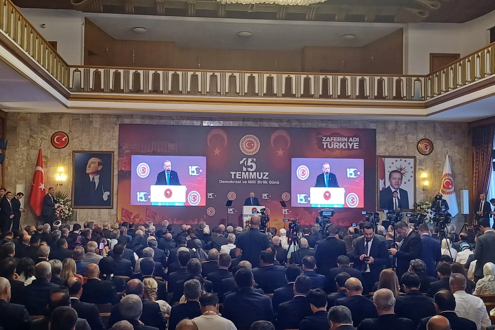 Konuşmasında önemli mesajlar veren Cumhurbaşkanı Recep Tayyip Erdoğan, 15 Temmuz gecesinin Türkiye’nin milli birlik ve beraberliğinin en güçlü göstergesi olduğuna dikkat çekti. Konuşmasında şehitleri rahmetle anan ve gazilere şükranlarını ileten Cumhurbaşkanı Erdoğan, 15 Temmuz’un Türk milletinin demokrasiye ve bağımsızlığa olan bağlılığını tüm dünyaya gösterdiğini vurguladı. Erdoğan, “O gece milletimiz canı pahasına vatanına, bayrağına, ezanına sahip çıktı” dedi.