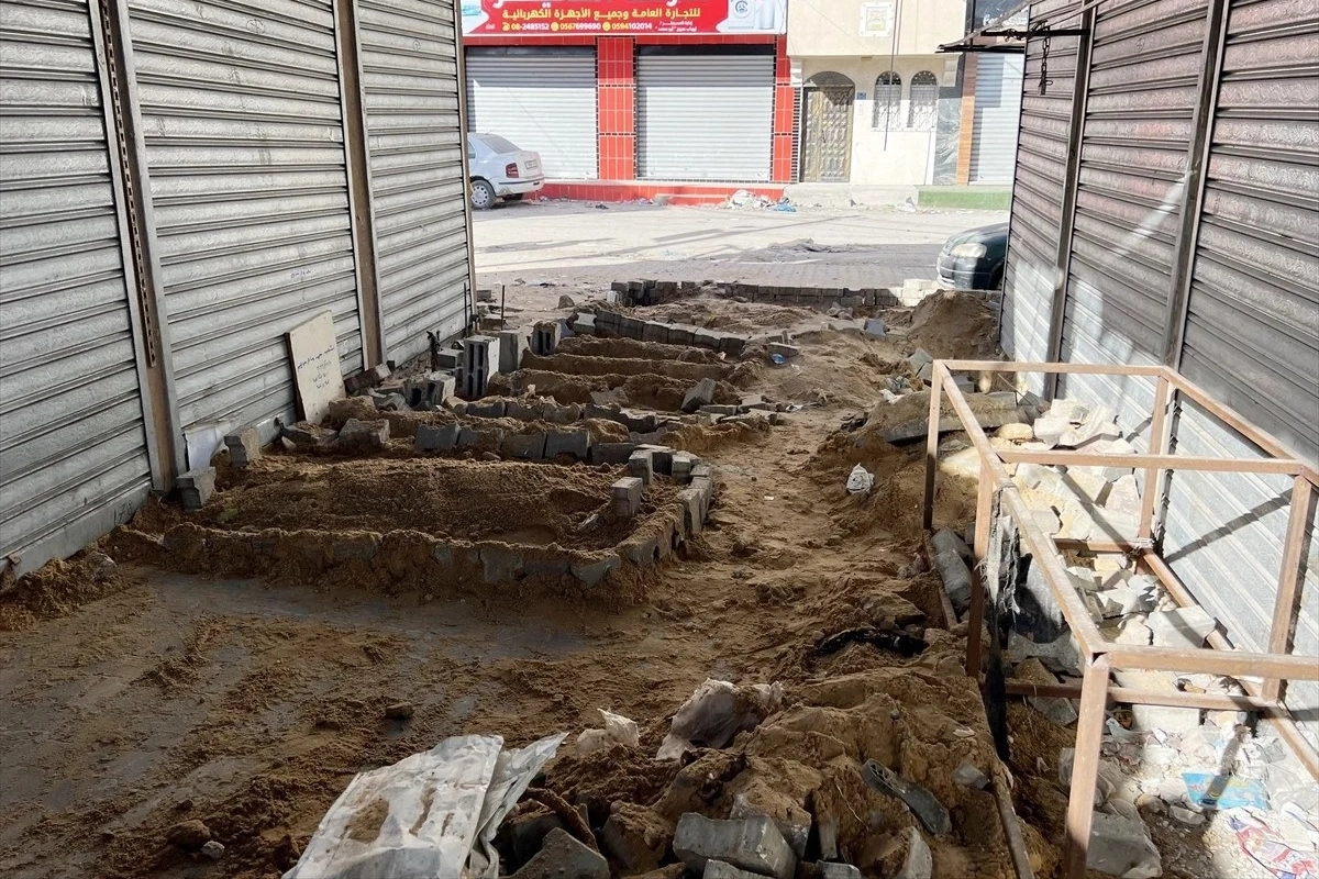 Havadan ve karadan saldırıların aralıksız bir şekilde sürdüğü Gazze'de bulunan Cibaliya Mülteci Kampı'nda kabristanların dolması ve yoğun saldırılar nedeniyle mezarlıklara ulaşılamadığı için halk, saldırılarda hayatlarını kaybeden yakınlarını çarşıda sokak aralarına defnediyor.