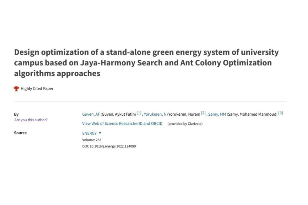 Yalova Üniversitesi Mühendislik Fakültesi Öğretim Üyesi Dr. Öğr. Üyesi Aykut Fatih Güven’in yazmış olduğu "Design optimization of a stand-alone green energy system of university campus based on Jaya-Harmony Search and Ant Colony Optimization algorithms approaches" başlıklı araştırma makalesi, Web of Science Core Collection'da, alanında en çok alıntılanan %1’lik dilime girerek, “Highly Cited Paper” kategorisinde yer aldı. Yalova Üniversitesi yetkilileri alınan bu başarı sonrasında sosyal mecralardan bir paylaşım gerçekleştirdi ve Güven’i tebrik ederek başarılarının devamını diledi. Yapılan paylaşımda şu ifadelere yer verildi, ‘’Çalışmalarından dolayı akademisyenimizi tebrik eder, başarılarının devamını dileriz.’’