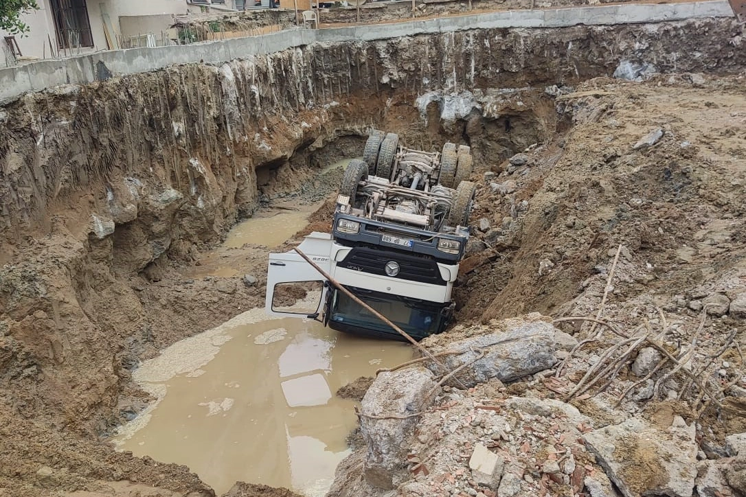 Gerçekleşen kazada can kaybı veya yaralı bulunmazken toprağın çökmesiyle temelin içinde devrilen hafriyat kamyonu düştüğü yerde ters dönerek maddi hasar gördü.