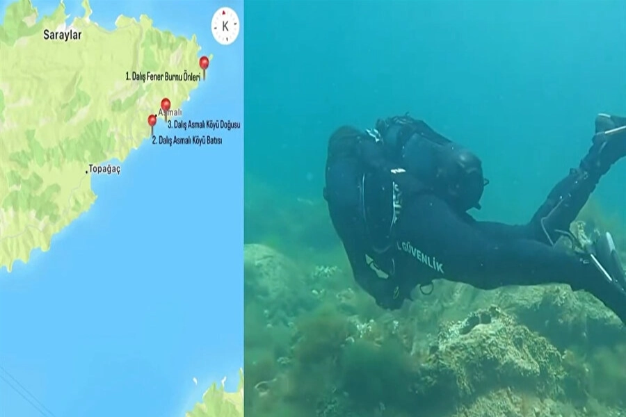 Bursa Emniyet Müdürlüğü Deniz Limanı Şube Müdürlüğü, Çanakkale Emniyet Müdürlüğü Deniz Limanı Şube Müdürlüğü ile Samsun Emniyet Müdürlüğü Deniz Limanı Şube Müdürlüğü'ne bağlı 13 kurbağa adam, su altında bir ize ulaşmak için dalış yapıyor.