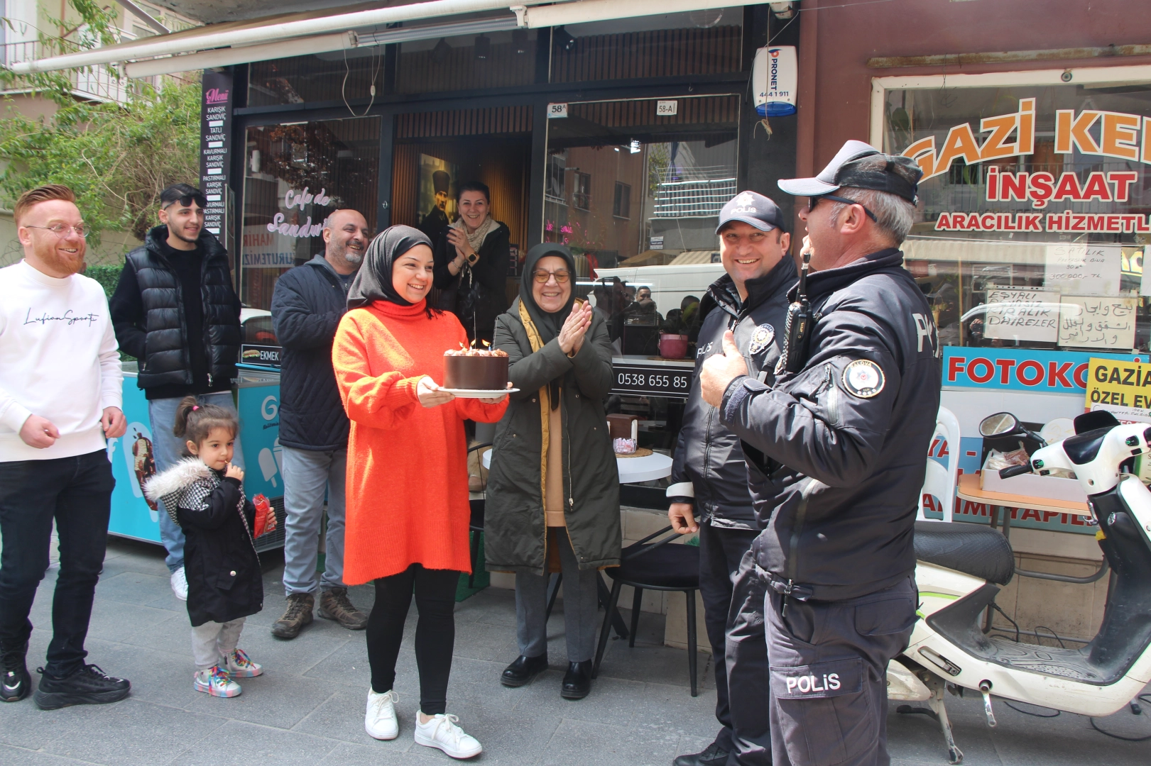 Hızla olay yerine ulaşan polis memurlarını pasta ile karşılayan esnaflar, polislerin haftasını kutladılar.