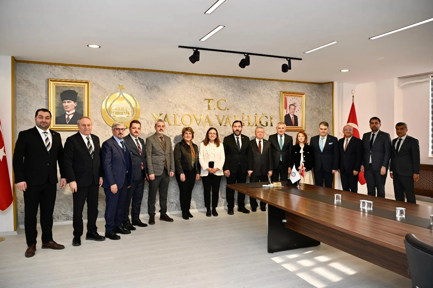 Kent Konseyleri Birliği 16. Dönem Başkanlık Devir Teslim Töreni ve Kent Konseyleri Mevzuat Çalıştayı Değerlendirme Toplantısı sonrasında dönem başkanı Hasan Soygüzel başkanlığındaki Türkiye Kent Konseyleri Birliği yönetim kurulu üyeleri, Yalova Valisi Dr. Hülya Kaya’yı makamında ziyaret ettiler. Ziyaretten duyduğu memnuniyeti dile getiren Vali Kaya, Kent Konseylerinin bulundukları illerde yerel yönetimlere verdikleri destek ve katkılardan övgü ile bahsetti. Bu anlamda Kent Konseylerinin yerel yönetimlerde daha aktif bir rol üstlenmelerini sağlamaya yönelik gerçekleştirilen Kent Konseyleri Mevzuat Çalıştaylarının değerlendirme toplantısına Yalova olarak ev sahipliği yapmaktan duyduğu memnuniyetin altını çizen Vali Kaya, bu mevzuatı da çok önemsediğini ifade etti. Kent Konseylerinin aktif hale gelmesinin yerel yönetimlerin de etkinliğini arttıracağına vurgu yapan Vali Kaya, “Kent Konseyleri, bulundukları illerde yerel yönetimlere verdikleri destek ve katkılarla önemli bir rol üstleniyor. Bu destek, kentlerin sürdürülebilir gelişimi açısından kritik öneme sahip. Konseylerin daha aktif hale gelmesi, yerel yönetimlerin etkinliğini artıracaktır” dedi.