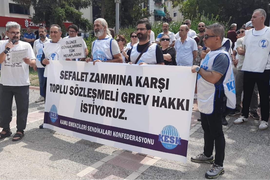 KESK üyeleri adına okunan açıklamada, hükümetin 2026 için %10+%6, 2027 için %4+%4 zam teklifine yalnızca 1.000 TL taban maaş artışı eklediği hatırlatılarak, bunun günlük bir simit parasına bile denk gelmediği ifade edildi.