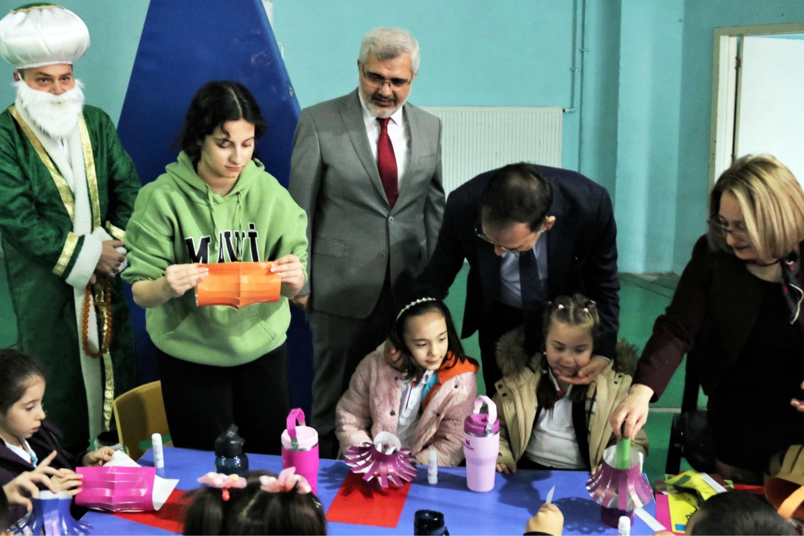 Daha önce Nasrettin Hoca gibi geleneksel figürlerin sahne aldığı etkinlik alanını ziyaret eden protokol üyeleri, okul öncesi çağdaki miniklerin oyunlarına eşlik ederek onlarla yakından ilgilendi.