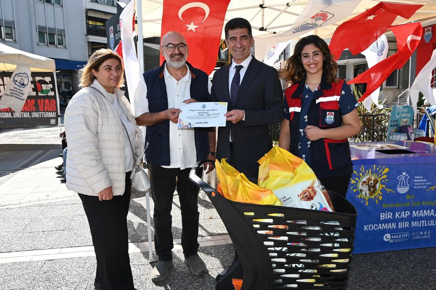 Yalova Belediyesi Veteriner İşleri Müdürlüğü tarafından düzenlenen “Mama Kumbarası” etkinliği, 1 Ekim 2025 Çarşamba günü büyük bir coşku ile start aldı. Gün boyunca çok sayıda vatandaş etkinlik alanındaki standı ziyaret ederek, sokaktaki can dostlar için mama desteğinde bulundu. Yalova Belediye Başkan Vekili Mesut Tutuğ da alanı ziyaret ederek, katkılarından dolayı ilk bağışçılara teşekkür sertifikası takdim etti.