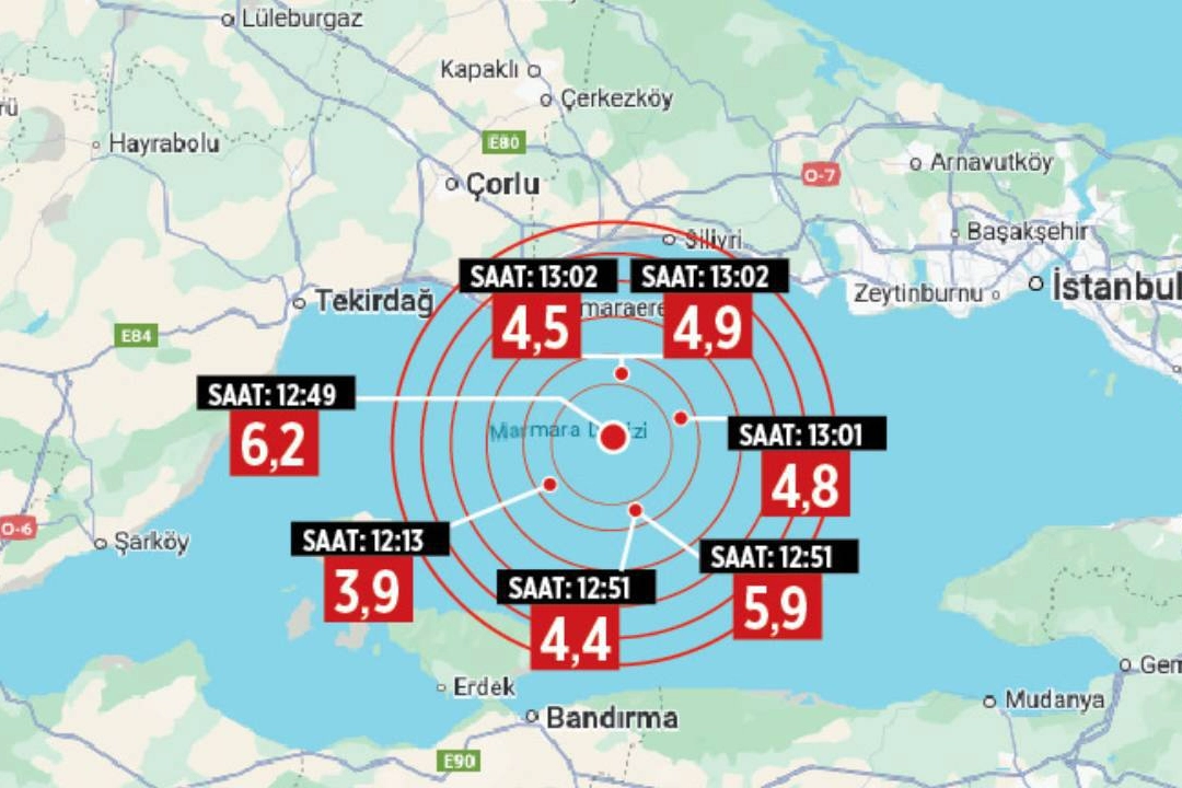 İstanbul'da, Silivri açıklarında dün, önce 3.9 ardından da 6.2 büyüklüğünde iki deprem meydana geldi. Depremin yerin 6.9 kilometre derinliğinde meydana geldiği belirlendi. Deprem Marmara Bölgesi'nin tamamında hissedildi. İki depremin ardındansa en büyüğü 5.9 ve 4.9 olan, 284 artçı (07.20 itibarıyla) deprem yaşandı.