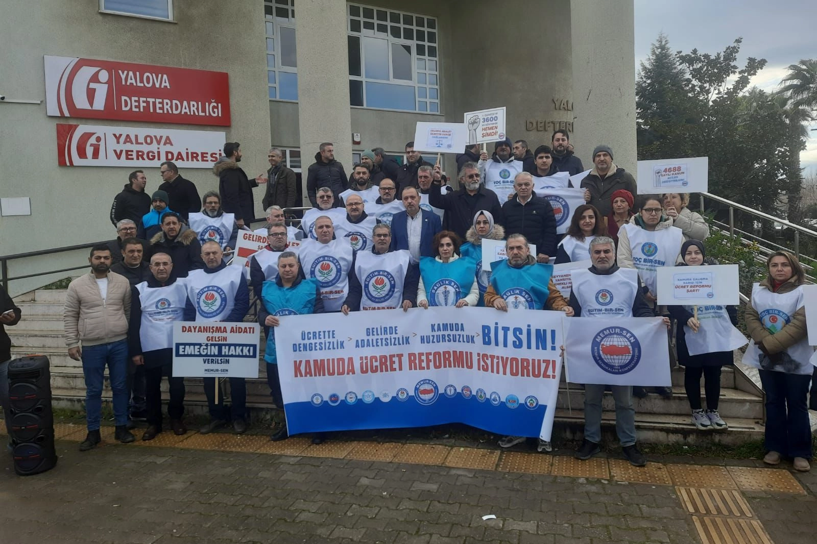 Memur-Sen Yalova İl Yönetimi ve sendika üyeleri, bugün 81 ille birlikte Yalova Defterdarlığı binası önünde basın açıklaması gerçekleştirdi. Basın açıklamasında memurun bu ülkenin yükü değil gücü olduğu vurgulandı. Ücrette dengesizlik ve gelirde adaletsizliğin kamuda huzursuzluğa yol açtığı ifade edildi. Açıklamada, kamu çalışanlarının alım gücünün her geçen gün düştüğüne dikkat çekildi.