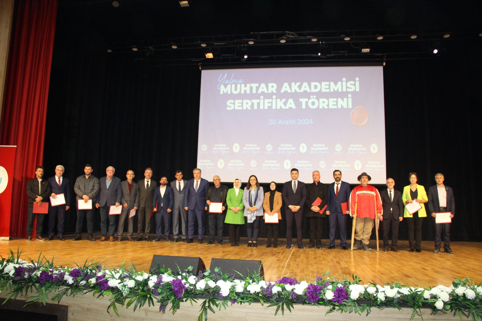 11 Aralık 2024 tarihinde startı verilen Muhtar Akademisi 10 gün boyunca süren yoğun ve kapsamlı eğitimlerle 20 Aralık 2024 tarihinde tamamlandı. Muhtar Akademisi’ni başarıyla tamamlayan muhtarlara sertifikaları ise Yalova Üniversitesi Mehmet Okul Kongre ve Kültür Merkezi'nde düzenlenen bir törenle takdim edildi. Törene Yalova Valisi Dr. Hülya Kaya, İçişleri Bakanlığı İller İdaresi Daire Başkanı ve Yeşilay Mütevelli Heyeti Üyesi Suna Üstüner, Yalova Üniversitesi Rektörü Prof. Dr. Mehmet Bahçekapılı, Türkiye Muhtarlar Konfederasyonu Genel Başkanı Kadir Delibalta, Yalova Muhtarlar Derneği Başkanı Mustafa Kandemir, il protokolü ve muhtarlar katıldı. “Bu güne kadar ki en kapsamlı eğitim” Törenin açılış konuşmasını Yalova Muhtarlar Derneği Başkanı Mustafa Kandemir yaptı. Gerçekleştirilen Muhtar Akademisi’nin bugüne kadar ki en kapsamlı eğitim olduğuna dikkat çeken Kandemir, “10 gün süren Muhtar Akademisi’ni başarıyla tamamladık. Bugüne kadar ki muhtarlara yönelik en kapsamlı eğitimin gerçekleştirildiğini mutlulukla ifade etmek isterim. Bu anlamda Yalova Valisi Dr. Hülya kaya olmak üzere emeği geçen herkese teşekkür ederim. Bildiklerimizi pekiştirdiğimiz ve eksik yönlerimizi ise tamamladığımız bu eğitimin halkımıza daha iyi hizmet yönünde bizleri geliştirdiğini de ifade etmek isterim” dedi.