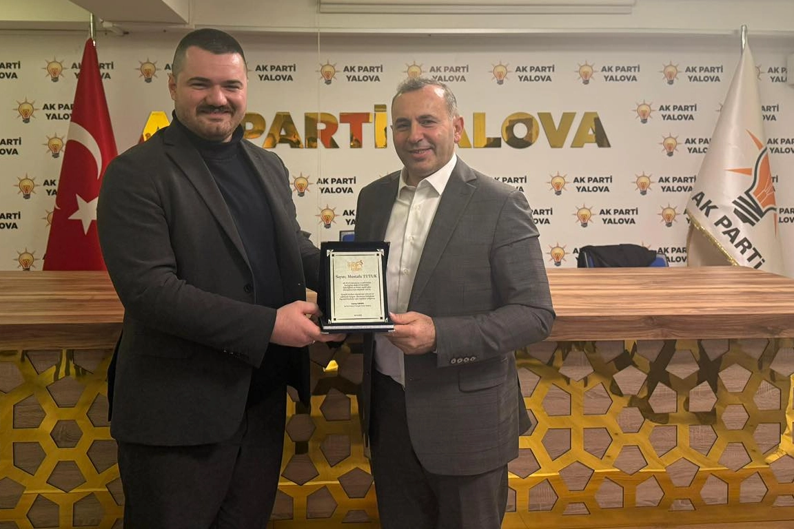 AK Partili gençlere siyasetle ilgili önemli öğütler veren Mustafa Tutuk’a Canay Caner tarafından plaket takdim edildi.