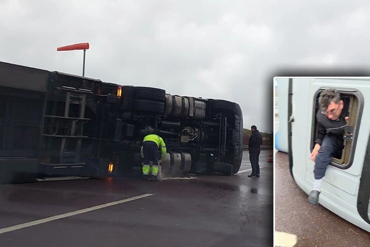 Diğer sürücülerin yardımına koştuğu tır sürücüsünün devrilen aracının kabininden çıkma anı kameraya yansıdı.