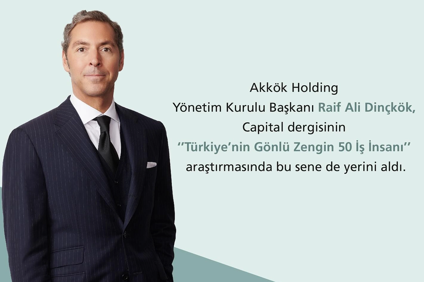 Dinçkök, “Sosyal sorumluluk faaliyetlerimize kararlılıkla devam edeceğiz”Farklı Akkök Holding grup şirketlerinde de Yönetim Kurulu Başkan Vekili ve Yönetim Kurulu Üyesi olarak yer alan Raif Ali Dinçkök, 2023 yılında tüm grup şirketleriyle birlikte yaptıkları bağışlarla Capital Dergisi’nin “Türkiye’nin Gönlü Zengin 50 İş İnsanı” araştırmasında yerini aldı. Akkök Holding olarak sürdürülebilir kalkınma projeleriyle toplumsal cinsiyet eşitliği, eğitim, kültür, sanat ve çevre konularında önemli adımlar atmayı sürdürdüklerini belirten Dinçkök, “Bu başarıyı kutlarken, ülkemizin gelişimine katkı sağlamaya devam edeceğimizi gururla belirtmek istiyoruz. Daha iyi bir gelecek için sosyal sorumluluk faaliyetlerimize kararlılıkla devam edeceğiz.” dedi.