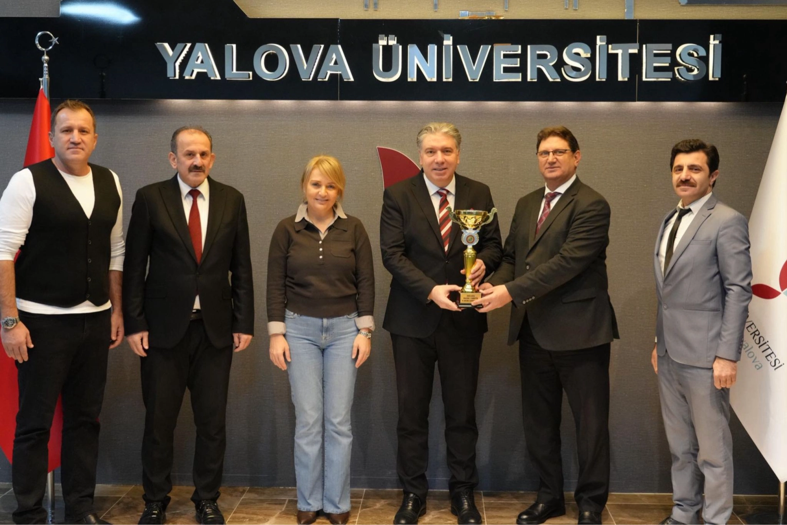 Yalova Üniversitesi Spor, 2025–2026 Sezonu 1. Amatör Futbol Ligi A Grubu’nda sergilediği üstün performansla ipi göğüsleyen taraf oldu. Sezon boyunca sahada ortaya koyduğu azim, disiplin ve mücadeleci ruhla rakiplerini geride bırakan üniversite ekibi, grubunu zirvede tamamlayarak şampiyonluk kupasını müzesine götürdü. Bu önemli başarıyla birlikte takım, 2026–2027 sezonunda Yalova Süper Amatör Küme’de mücadele etme hakkı kazanarak üniversite camiasına büyük bir gurur yaşattı. Şampiyonluk sevincinin ardından kulüp yönetimi ve teknik heyet, kazanılan kupayı Rektörlük makamına taşıdı. Sağlık, Kültür ve Spor Daire Başkanı ve aynı zamanda Yalova Üniversitesi Spor Kulübü Başkanı olan Yalçın Tokay öncülüğündeki heyet, Yalova Üniversitesi Rektörü Prof. Dr. Mehmet Bahçekapılı ve Rektör Yardımcısı Prof. Dr. Senay Yürür Karslıoğlu’nu ziyaret etti. Ziyarette şampiyonluk kupası Rektör Bahçekapılı’ya takdim edildi. Teknik heyeti ve yönetimi elde edilen zaferden dolayı tebrik eden Rektör Prof. Dr. Mehmet Bahçekapılı, üniversite olarak spora ve sporcuya verdikleri desteğin sahada somut bir başarıya dönüşmesinden duyduğu memnuniyeti dile getirdi. Şampiyonluğun üniversiteye çok yakıştığını vurgulayan Bahçekapılı, Süper Amatör Küme yolculuğunda takıma başarı dileklerinde bulundu.