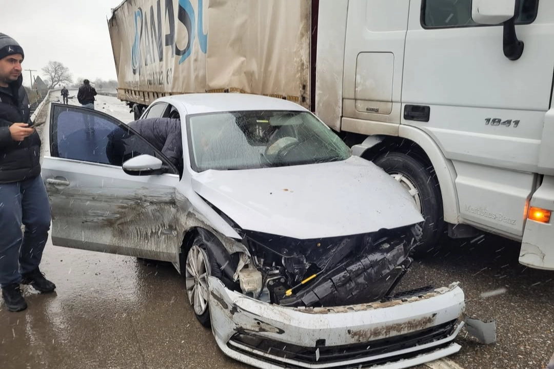 Çarpışmanın etkisiyle otomobil TIR’ın yan tarafına sıkışarak bu şekilde metrelerce sürüklendi. Son anda kazayı fark eden TIR sürücüsü aracı durdurdu.