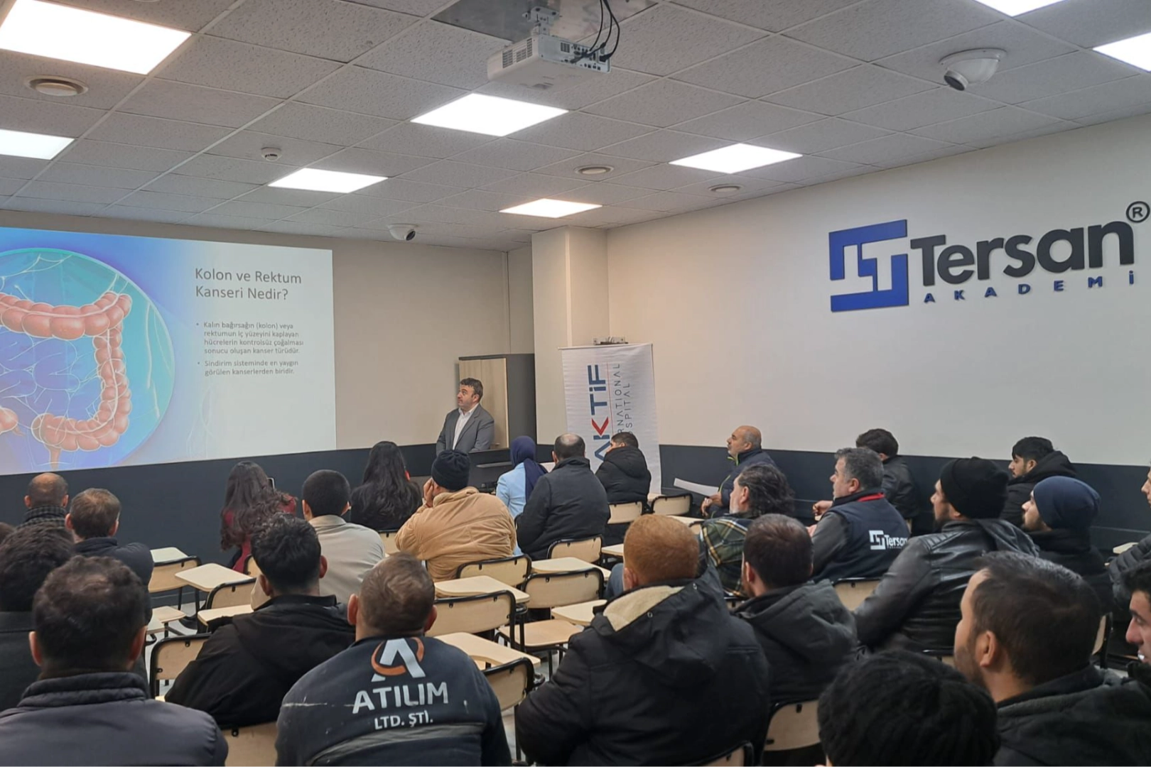 Seminerde, Genel Cerrahi Uzmanı Op. Dr. Emre Özoran tarafından kolon kanserinin erken tanısı, risk faktörleri, belirtileri ve güncel tedavi yöntemleri hakkında kapsamlı bir sunum yapıldı.