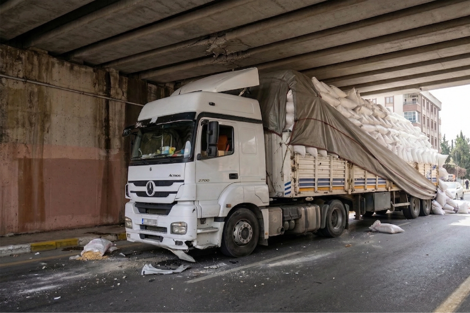 Yalova’da sabahın erken saatlerinde dikkatsizlik sonucu meydana gelen trafik kazası, karayolunda hareketli dakikalara neden oldu. Yalova-Kocaeli karayolu üzerinde seyir halinde olan ve dorsesinde çuvallanmış yük taşıyan bir TIR, eski hastane yolundaki köprünün altından geçmek istedi. Sürücüsünün yük yüksekliğini hesaba katmadan girdiği köprü altında, dorsedeki çuvallar beton kirişlere şiddetle çarptı. Çarpmanın etkisiyle araç üzerindeki yük yola savrulurken, şans eseri arkadan gelen başka bir aracın yüklerin altında kalmaması olası bir faciayı önledi.