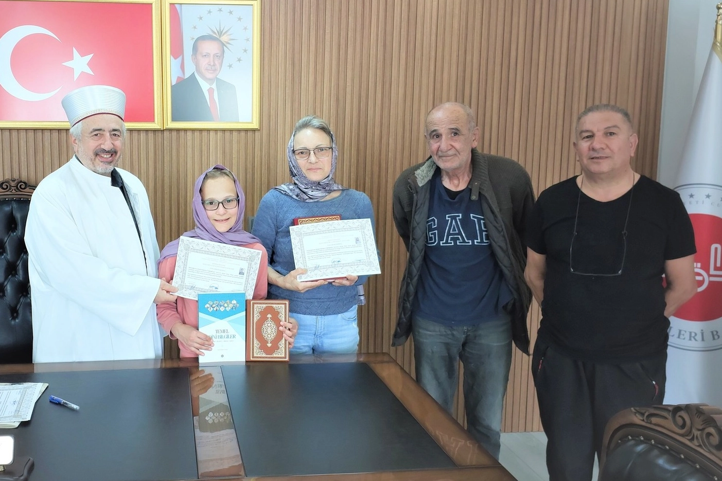 Müftü Ulusoy’un rehberliğinde Kelime-i Şehadet getiren Elina ve kızı Zlata, İslam dinine geçişlerini resmileştirdi. Elina Meryem, kızı Zlata ise Dilara ismini aldı. Müftü Ulusoy, Müslüman olan kişilerin günahsız hale geldiğini ve Allah’a yönelerek dini vecibelerini yerine getirmeleri gerektiğini ifade etti.Merasim sonunda ihtida belgeleri takdim edilirken, anne ve kızına mealli Kur’an-ı Kerim ile dini bilgiler kitabı hediye edildi. İslam’ı daha iyi öğrenmek isteyen anne-kız için Vaiz Reyyan Arslan ve Kur’an Kursu Öğreticisi Emine Çalışır görevlendirildi.