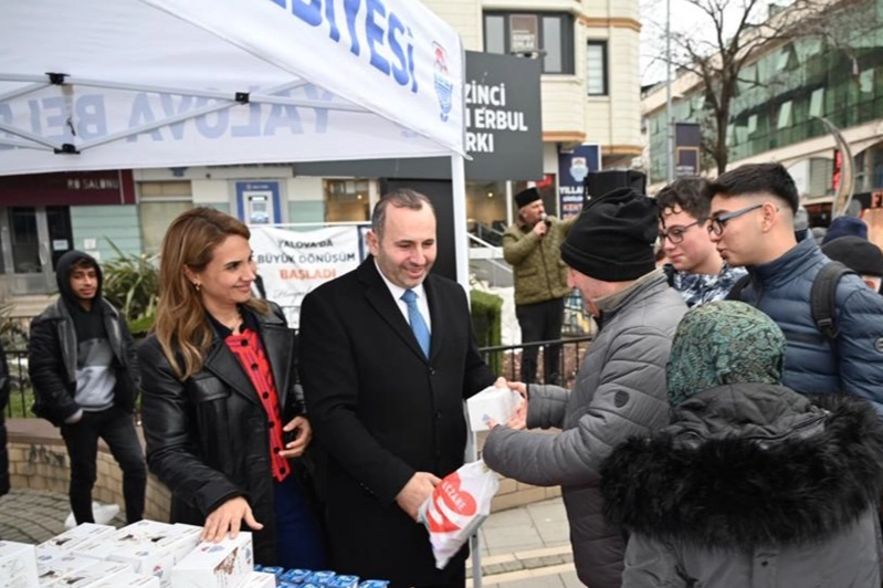 İlk olarak Yalova 15 Temmuz Demokrasi ve Cumhuriyet Meydanı ve Cumhuriyet Caddesi’nde gerçekleştirilen kandil simidi dağıtımında Yalova Belediye Başkanı Mustafa Tutuk ve eşi Gökşen Şahin Tutuk vatandaşların kandilini kutladı.