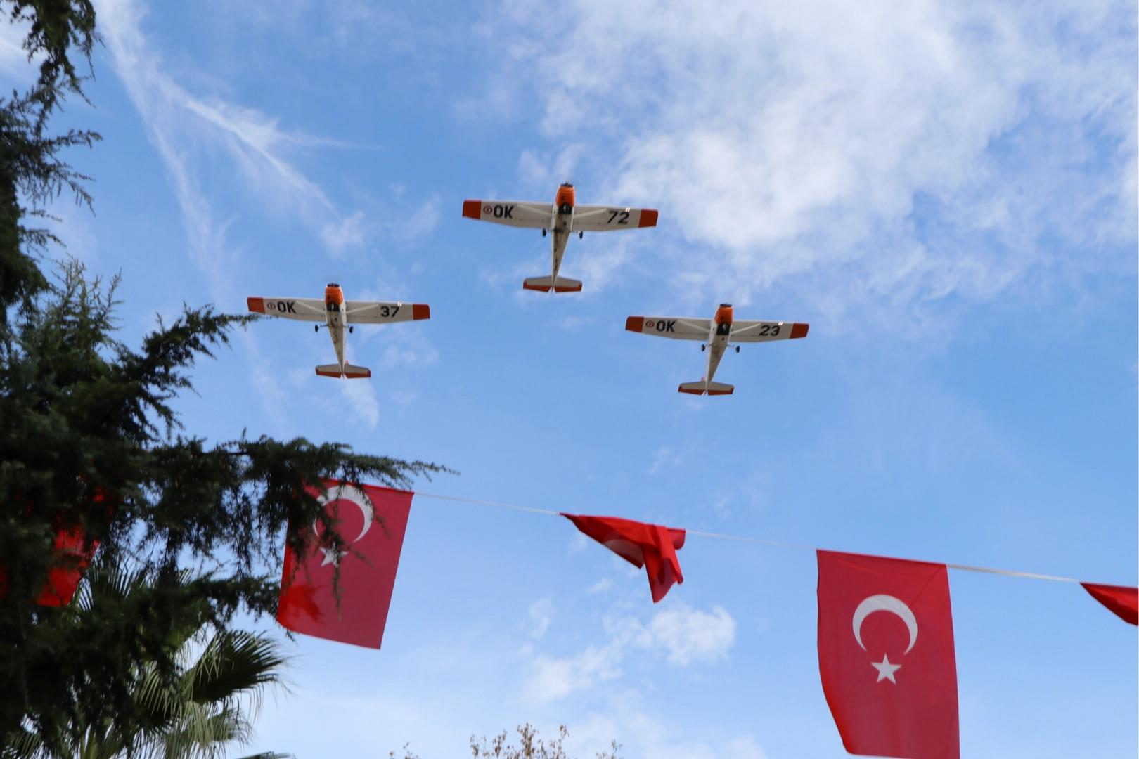 Çiftlikköylülerin yoğun ilgi gösterdiği kutlamalar, Çiftlikköy Kaymakamı Ömer Bilgin, Hava Meydan Komutan Vekili Albay İsmail Arıcan ve Çiftlikköy Belediye Başkanı Ali Murat Silpagar’ın tören alanını selamlamasıyla başladı. Renkli görüntülere sahne olan etkinliklerde Hava Meydan Komutanlığı’nın 126. Filo pilotlarının, Hv. Plt. Alb. Mert Uysal komutasında T-41 uçaklarıyla yaptığı tören uçuşları, Çiftlikköylüler tarafından ilgiyle ve alkışlarla izlendi.
